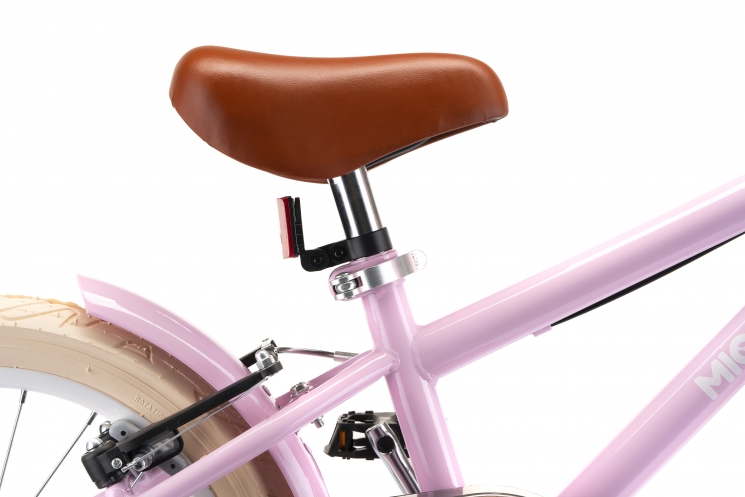 Кермо та сидіння регулюються по висоті в широкому діапазоні. Сидіння м'яке, з покриттям із ECO-шкіри. Грипси керма м'які гумові, з боковим захистом рук під час падіння. Ручне гальмо V-Brake і на передньому, і задньому колесі забезпечать надійне гальмування. Диск колеса 16` традиційний, спицевий з класичною втулкою на підшипниках. Високий та широкий профіль покришки забезпечать комфортне катання як по асфальту, так і по нерівностям. Колеса додатково захищені бризковики пофарбовані в колір велосипеда і надійно захистять від бруду і бризок.
