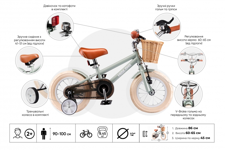 У комплектацію велосипеда входить 2 катафоти, дзвіночок на кермо, набір інструментів для збирання та обслуговування велосипеда, кошик з натурального ротанга, набір бічних навчальних коліс.