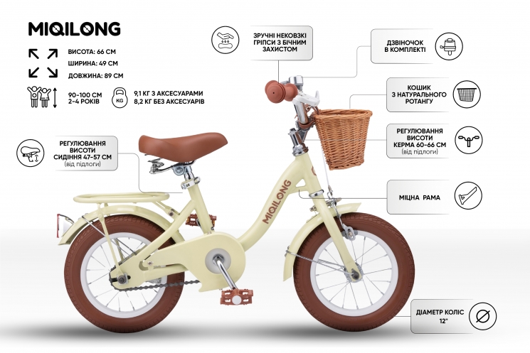 Технічні характеристики Дитячий велосипед Miqilong LS 12" бежевий: