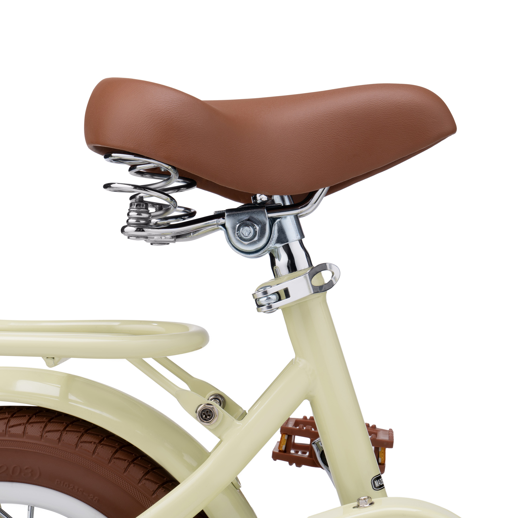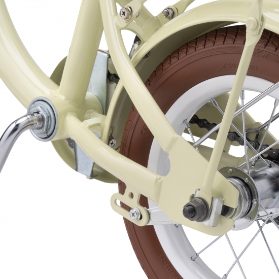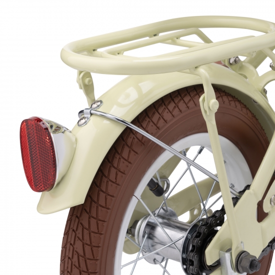 Диск колеса 12" традиційний, зі спицями та класичною втулкою на підшипниках. Високий та широкий профіль покришок забезпечить комфортну їзду як по асфальту, так і по нерівностям. Колеса додатково захищені металевими бризговиками, забарвленими у колір велосипеда. Вони надійно захистять від бруду і бризк.