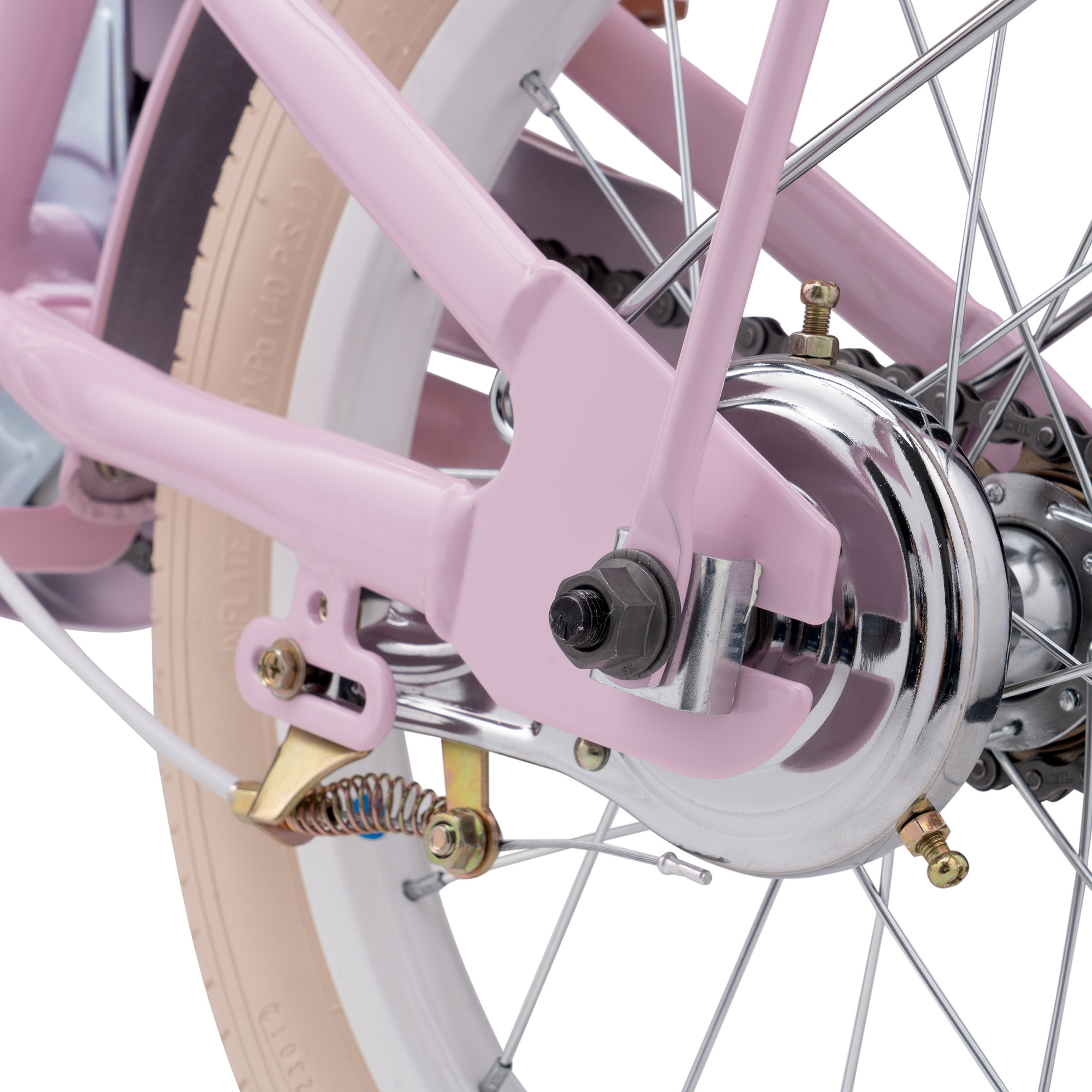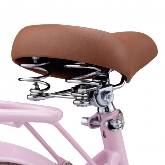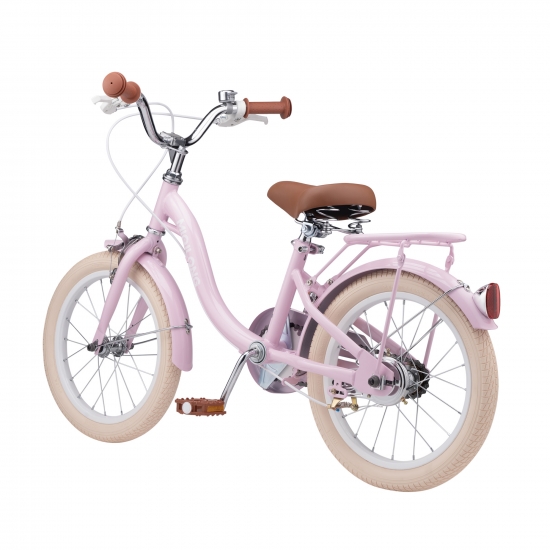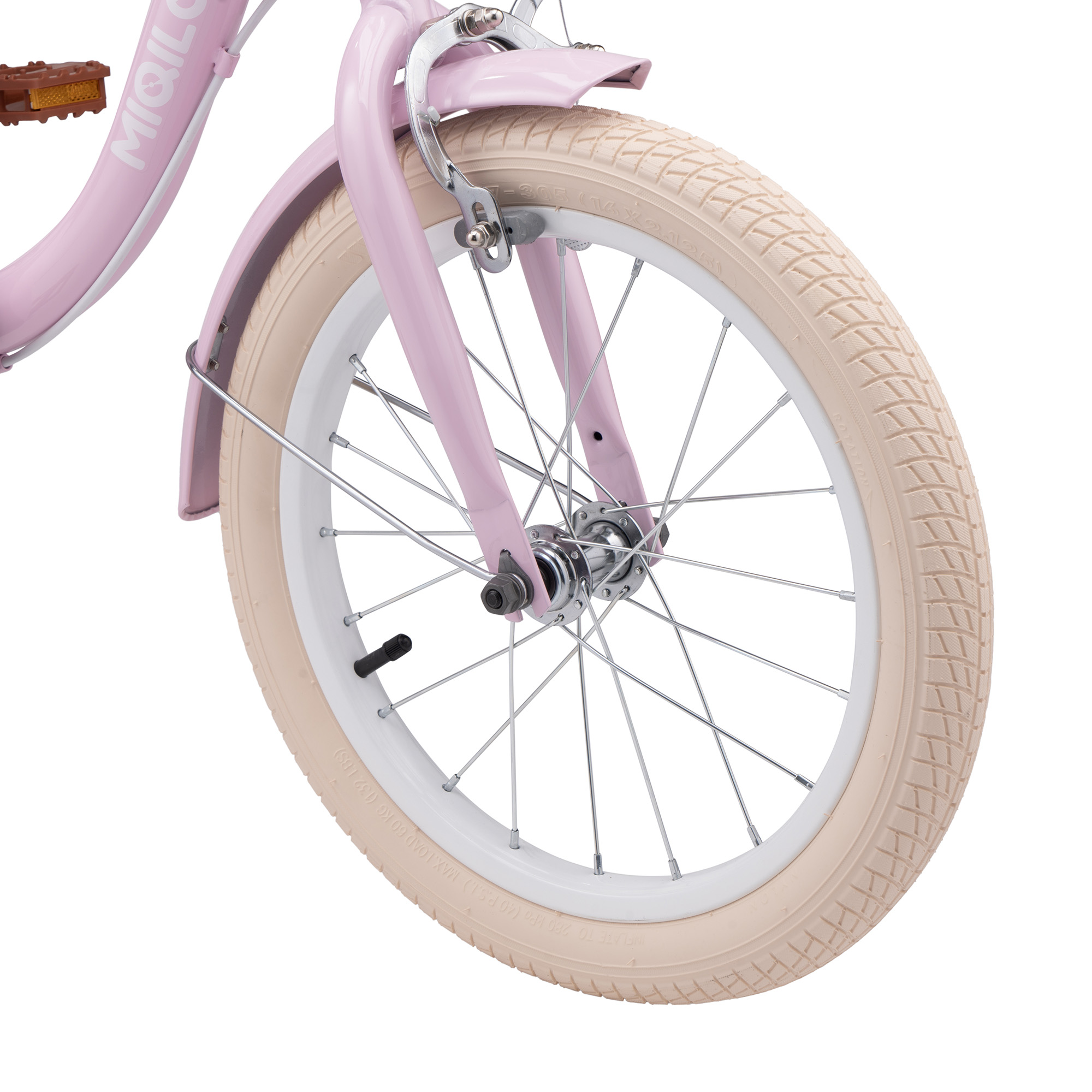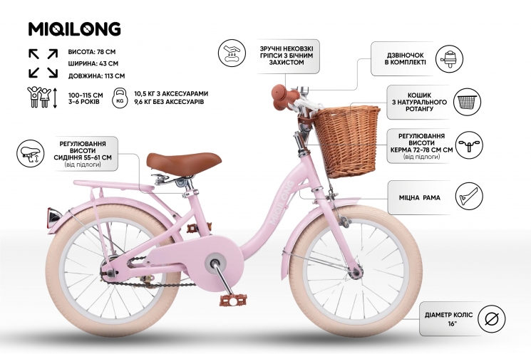 Кермо та сидіння регулюються по висоті в широкому діапазоні. Сидіння м'яке, з покриттям з ECO-шкіри та амортизаційними пружинами. Ручки керма м'які, гумові, з боковим захистом рук при падінні. Ручні гальма, V-Brake на передньому та барабанний механізм на задньому гарантують надійне гальмування. Колесо 16" стальне, традиційнезі спицями та класичною втулкою на підшипниках. Високий і широкий профіль покришок забезпечать комфортну їзду як по асфальту, так і по нерівностям. Колеса додатково захищені металевими бризковиками, забарвленими у колір велосипеда, що надійно захистить від бруду і бризк.