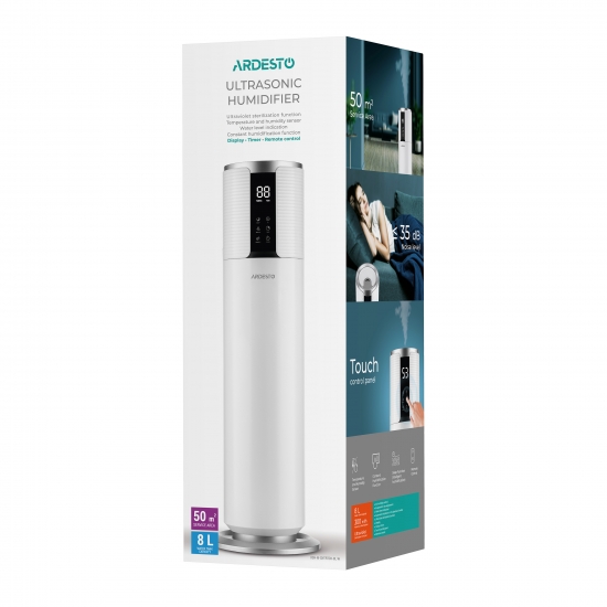 Конструкція ARDESTO USH-M-CNTRTCH-8L-W ергономічна. Заливання води у зволожувач верхнє, тож контролювати його рівень дуже легко. Якщо резервуар стане порожнім – передбачено автоматичне вимкнення. Для зручного керування в комплектованні наявний пульт.