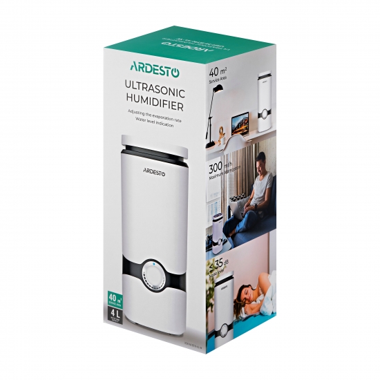 Опис Зволожувач повітря ARDESTO ультразвуковий, 40м2, 4л, 300мл/г, мех. кер-ння, верх. залив води, білий