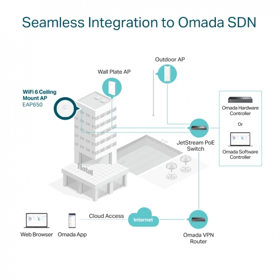 Платформа Omada Software Defined Networking (SDN) об’єднує мережеві пристрої, включаючи точки доступу, комутатори та маршрутизатори. Він забезпечує 100% централізоване керування хмарою та створює масштабовану мережу, керовану з єдиного інтерфейсу.