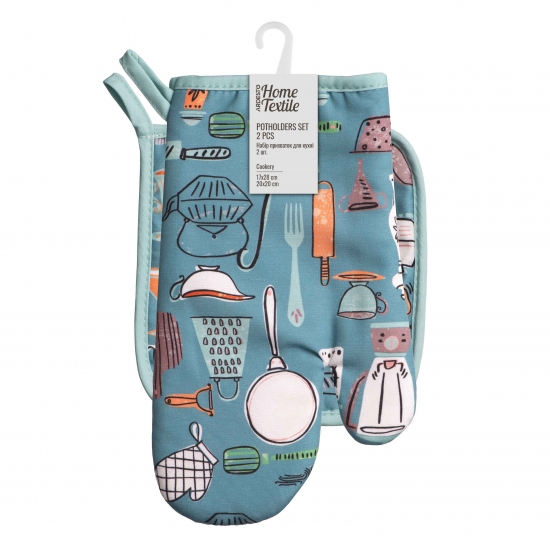 Прихватка – незамінний на кожній кухні аксесуар, який вбереже руки від опіків під час приготування. Кілька прихваток у дизайні Cookery прикрасять робоче місце на будь-якій кухні та полегшать приготування. Розмір виробів із набору становить 17 × 28 см та 20 × 20 см. Матеріали виготовлення поліестер (90 %) і бавовна (10 %) забезпечать тривалий термін слугування. Під час догляду потрібно дотримуватися таких умов: прати в пральній машині за 30 °C на делікатному режимі; сушити в машині за низької температури; не відбілювати; не чистити будь-яким розчинником, крім трихлоретилену; прасувати за температури до 110 °C.