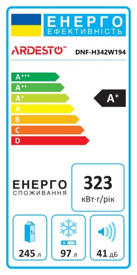 Опис Холодильник ARDESTO з нижн. мороз., 195x60х67, холод.відд.-245л, мороз.відд.-97л, 2дв., А+, NF, диспл зовн., зона св-ті, білий