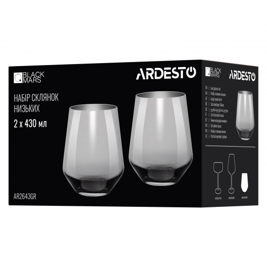 Склянки ARDESTO серії Black Mars – це витончені та сучасні форми, які пасують до сервірувань чи не будь-якого стилю. У наборі дві склянки, їх об’єм становить 500 мл – оптимальна місткість для подавання різноманітних напоїв, зокрема соків, освіжних лимонадів, коктейлів із льодом. Посуд виготовлено з прозорого сірого скла за спеціальною технологією, що забезпечує тривалий термін слугування навіть за частого використання. Вироби не рекомендовано мити в посудомийній машині. Набір стильних склянок ARDESTO Black Mars буде вдалим подарунком для близьких і друзів.