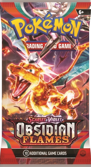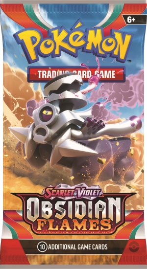 Розпечене вугілля освітлює тьмяну темряву ночі, а іскри спалахують у вогні, коли Чарізард виривається вперед з новонабутими силами темряви! Блискучий феномен Терастала наділяє деяких покемонів, таких як Тиранітар, Ейскью і Веспіквен, іншими типами, ніж зазвичай, тоді як Драгонайт та Гридент демонструють майстерність своїх внутрішніх сил. Щоб не відставати, Реваврум, Мелметал та інші покемони обіцяють змінити хід битви у доповненні до Scarlet & Violet—Obsidian Flames! Кожен бустер містить 10 карт та 1 базову енергію. Картки різняться залежно від комплекту.
