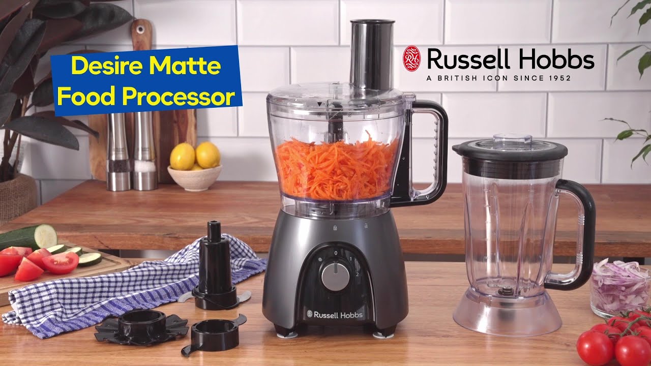 Опис Кухонна машина Russell Hobbs Desire Matte Charcoal, 600Вт, чаша-пластик, корпус-пластик, насадок-4, чорний