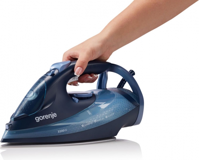 Опис Праска Gorenje, 3250Вт, 420мл, паровий удар-250гр, верт. відпарювання, антинакип, автовідключення, керам. підошва, чорно-синій