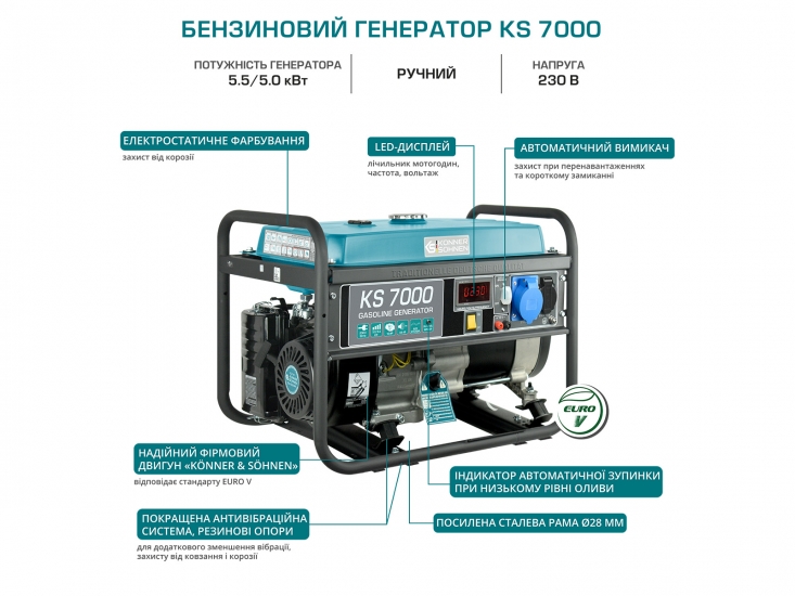 Двигуни Könner & Söhnen вирізняються легким стартом та пониженою вібрацією. Лінійка бензинових генераторів KS 7000 оснащена надійним 1-циліндровим двигуном потужністю 13 к.с.