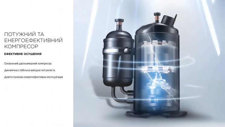 - Потужний компресор забезпечує стабільну і продуктивну роботу пристрою.