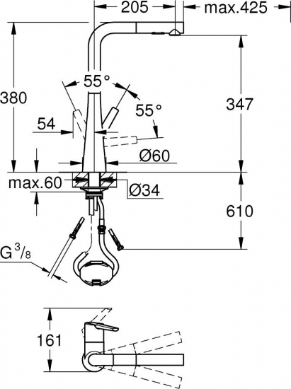 Опис Змішувач для кухні Grohe Scala, довж.виливу - 205мм, поворотний/витяжний, 1важіль, супер сталь