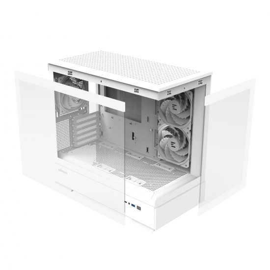 Передня та бічна панелі – загартоване скло зі зручним та практичним безгвинтовим кріпленням. Прозорий панорамний корпус підкреслює візуальний ефект вентиляторів ARGB і виглядає стильно.