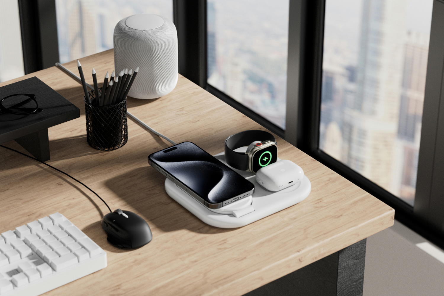 Особливістю моделі є складна конструкція, яка дозволяє легко перевозити зарядну станцію, зберігаючи її компактність. М'яка силіконова поверхня та нековзна основа забезпечують захист пристроїв під час заряджання. Режим StandBy дозволяє перетворити iPhone на функціональний дисплей, додаючи функціональності вашому робочому чи домашньому простору.