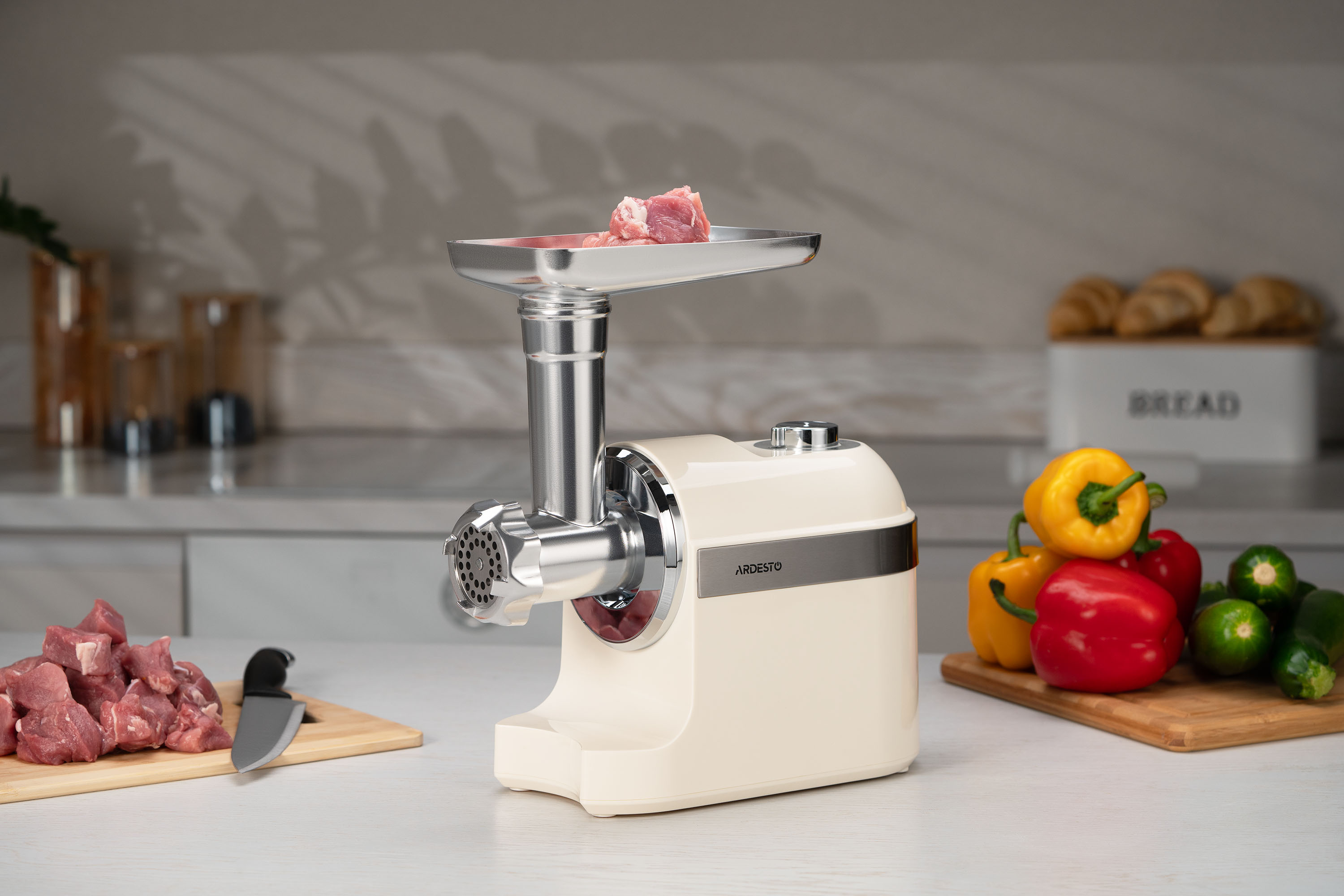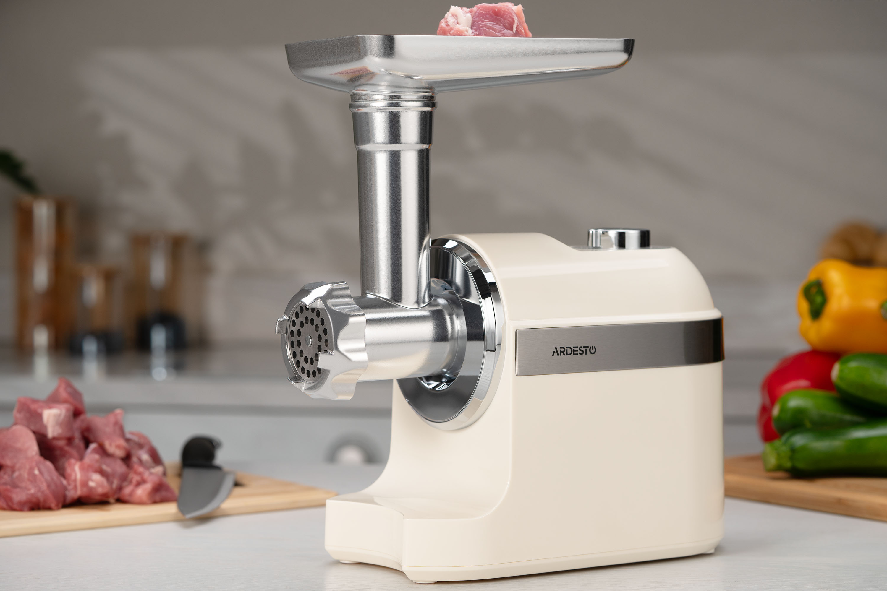 Головна - Побутова техніка, інструменти та товари для дому - Техніка для кухні - Для підготовки продуктів - М'ясорубки - ARDESTO - М'ясорубка, 1800Вт, 2кг/хв, 3 решітки, насадка для ковбас, кеббе, пластик, бежево-сріблястий