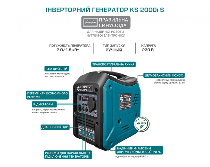 Портативний генератор KS 2000i S німецької ТМ «Könner & Söhnen» - це зручне джерело електроенергії в шумозахисному корпусі. Вбудований електронний блок з мікропроцесорним управлінням контролює роботу генератора і забезпечує фіксовану частоту 50 Гц і напругу 230В. Економічний режим дозволяє знизити витрату палива до 50% при малих навантаженнях завдяки зниженню обертів двигуна. Альтернатор з мідною обмоткою і потужний двигун K&S гарантують безаварійне і тривале використання та відповідають всім європейським стандартам якості. Наявність LED-дисплея дає можливість якісніше контролювати роботу генератора і своєчасно проводити його технічне обслуговування.