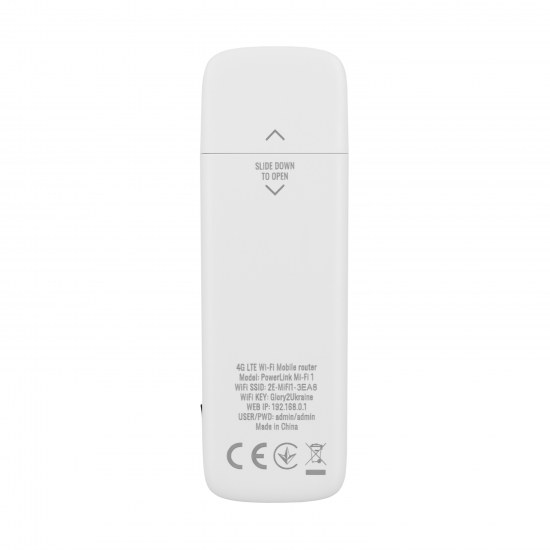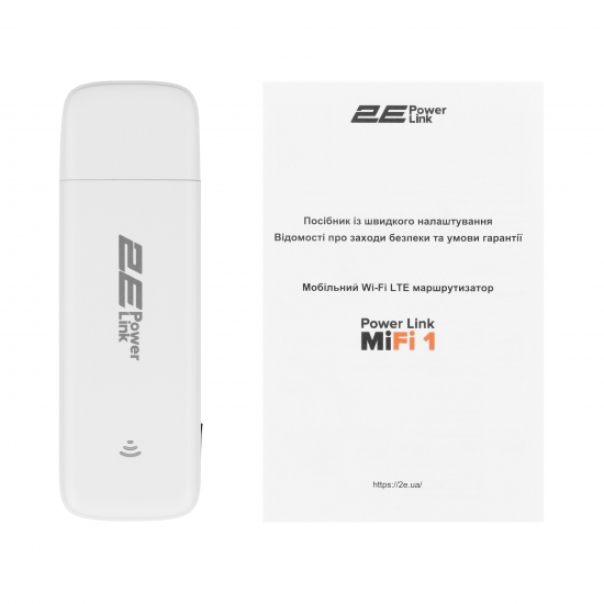 2E PowerLink MiFi 1 виготовлено у формфакторі USB Flash-карти, що робить його портативним і зручним для транспортування. Легкий пластиковий корпус білого кольору не лише має стильний вигляд, але і практичний щодо використання. Завдяки компактному розміру (96,5 × 31,2 × 11,6 мм) і вазі лише 26 г пристрій можна носити в кишені або сумці – він не займає багато місця.