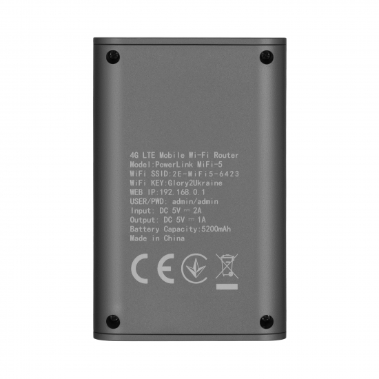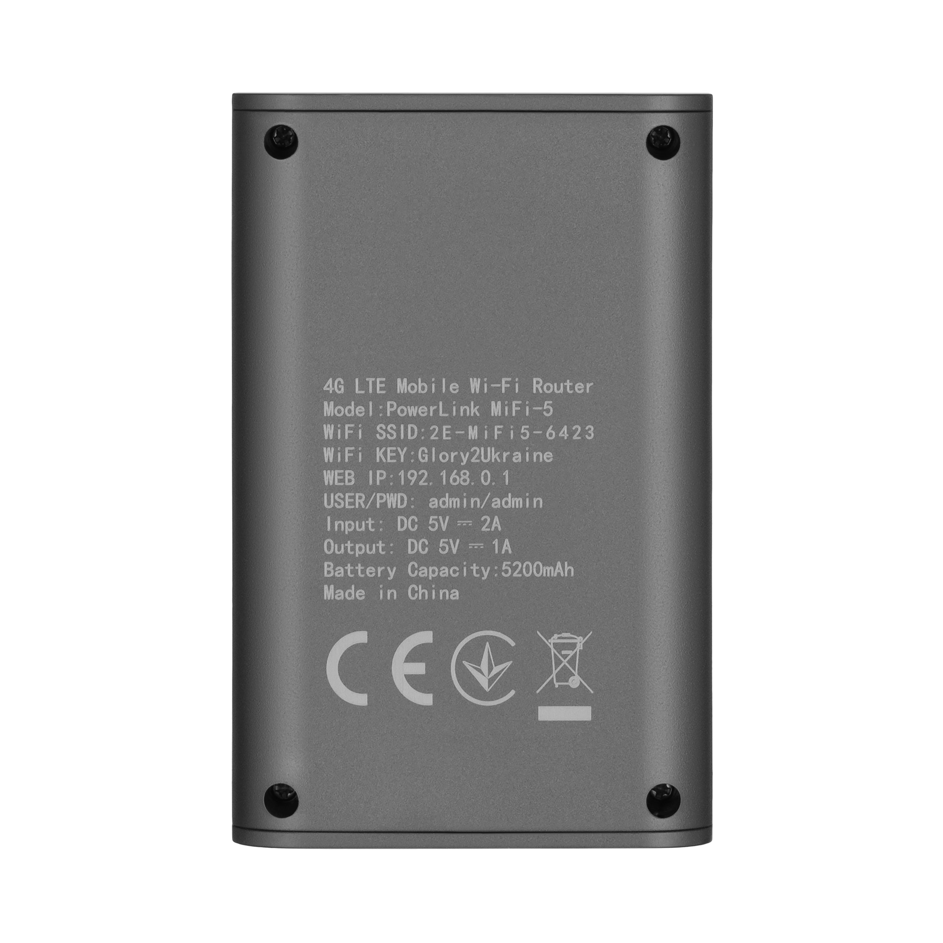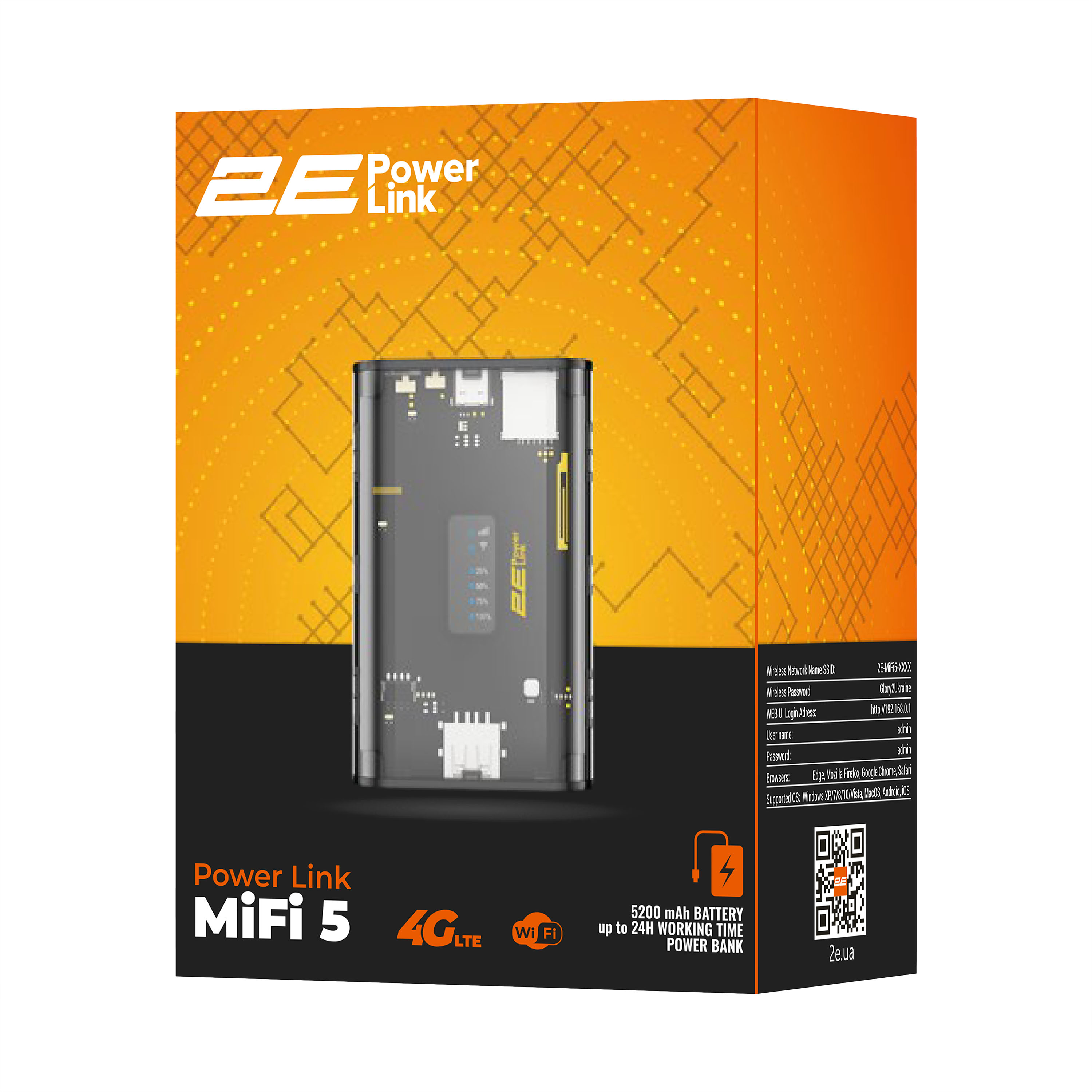 2E PowerLink MiFi-5 підтримує 1 × Nano SIM (4FF) і працює в усіх популярних діапазонах LTE, як-то FDD LTE: B3/B7/B8/B20 (1 800/2 600/900/800 МГц) і TDD LTE: B38/B40/B41. Окрім цього, пристрій також сумісний із мережами 3G UMTS/WCDMA на частотах B1/B8 (2 100/900 МГц), гарантуючи стабільне підключення навіть у місцевостях з обмеженим LTE-покриттям.