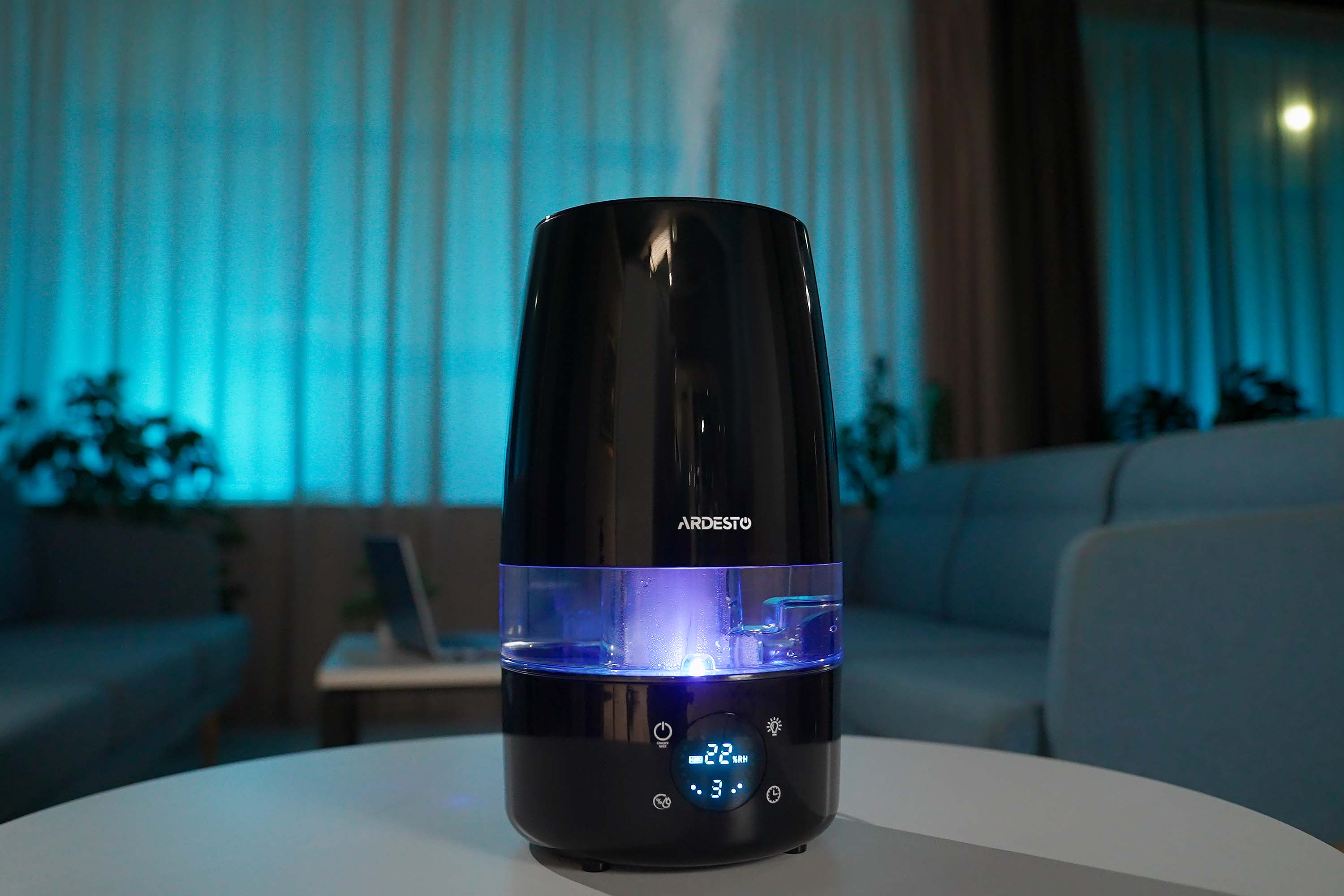Опис Зволожувач повітря ARDESTO ультразвуковий, 30м2, 4л, 280мл/г, електр. кер-ння, пульт ДК, верх. залив води, дисплей, чорний