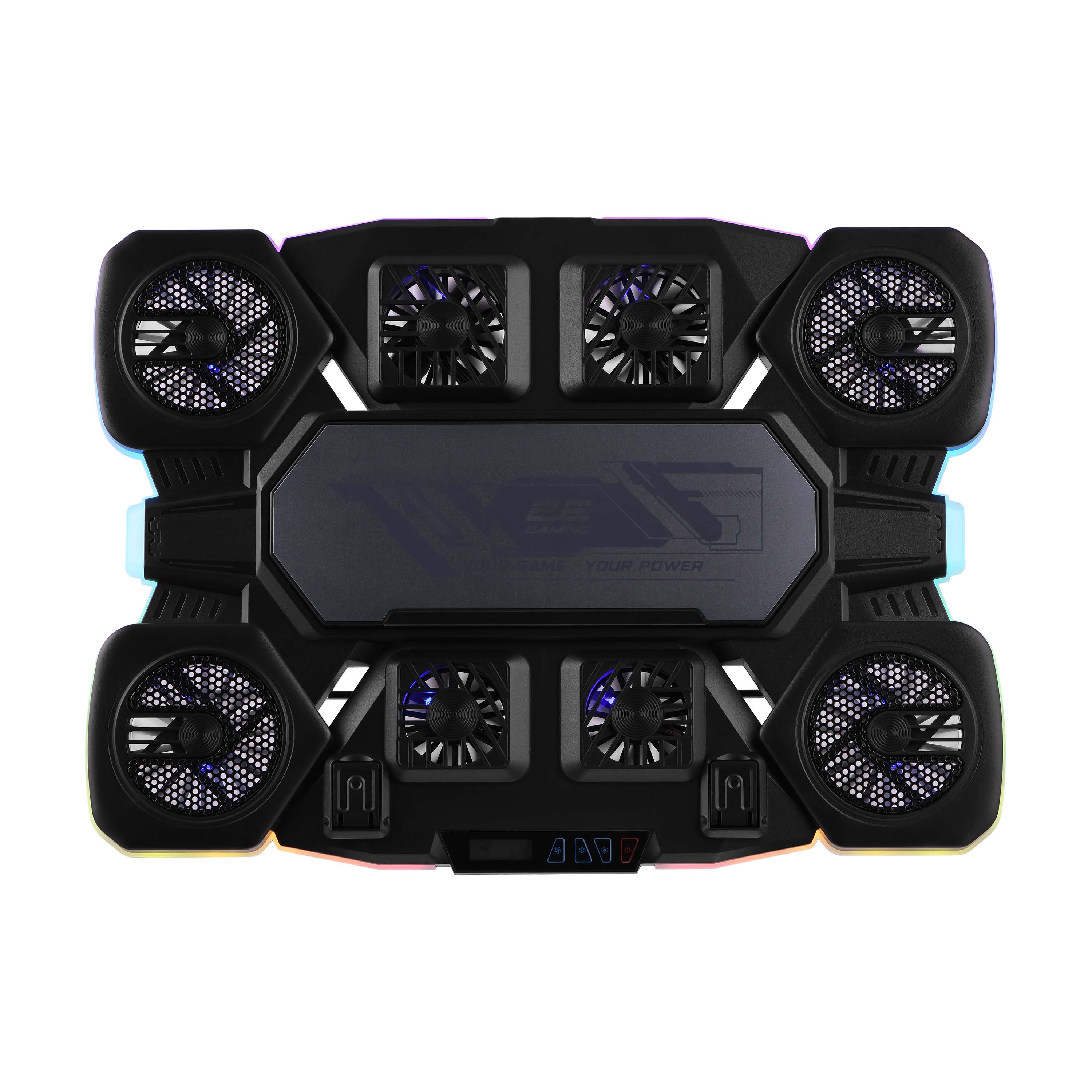 Підставку 2E GAMING CPG-012 оснащено 8 вентиляторами, які забезпечують не тільки ефективне охолодження, але й можливість регулювання швидкості їх обертання для оптимального балансу між тишею і потужністю. Чотири великі вентилятори розміром 70 × 70 × 15 мм досягають швидкості обертання до 2 000 об/хв, а менші – 50 × 50 × 15 мм (2 шт.) та 60 × 60 × 15 мм (2 шт.) – до 2 800 об/хв, гарантуючи ефективне охолодження ноутбука навіть під час інтенсивного навантаження. Передбачено п’ять рівнів швидкості.