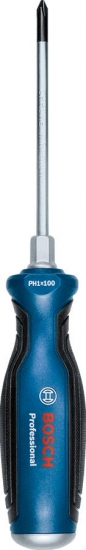 Професійна хрестоподібна викрутка Bosch PH1 надзвичайно міцна завдяки суцільному металевому стрижню, який також проходить через ручку, металевим ударним наконечникам і загартованому наконечнику. Ергономічна форма та м'яка поверхня рукоятки забезпечують комфорт, а вбудований шестигранне гніздо дає змогу застосовувати додатковий крутний момент. Підходить для загвинчування, довбання та відкручування тугих гвинтів.