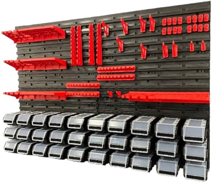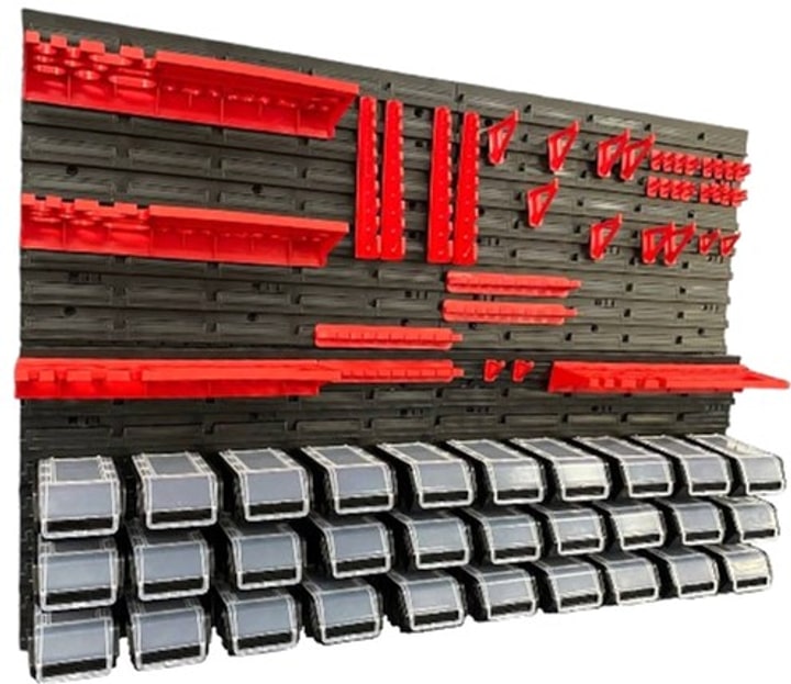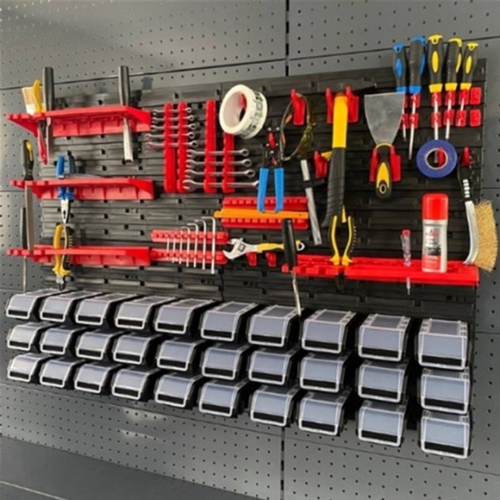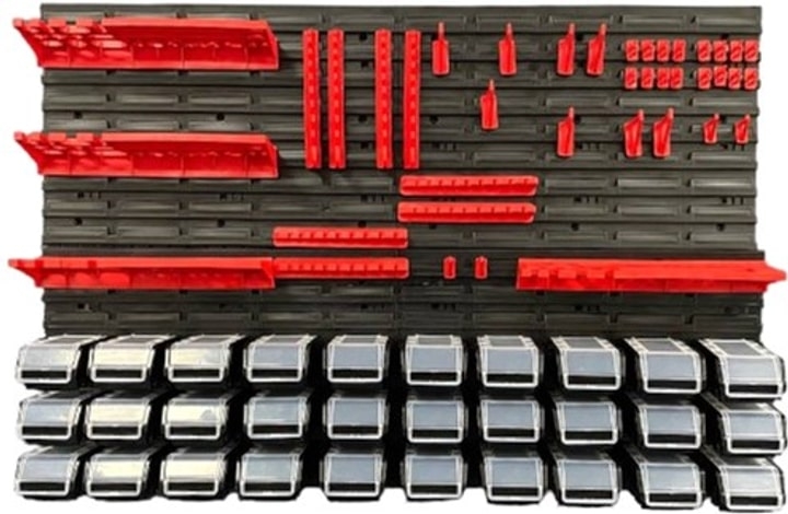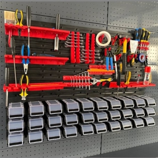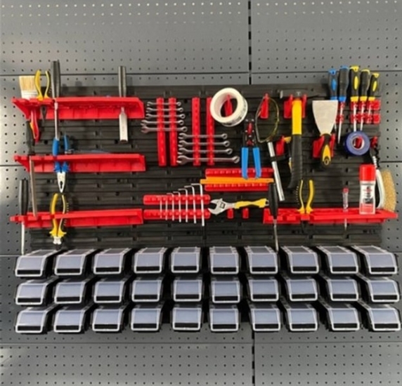 Головна - Побутова техніка, інструменти та товари для дому - Інструмент та обладнання - Ручний інструмент - Ящики, органайзери і сумки для інструментів - Kistenberg - Панель підвісна з набором контейнерів, гачків та полиць KS_kit12, 4 панелі 57.6*1.8*39см, 30 контейнерів, 40 гачків, 4 полиці, пластик