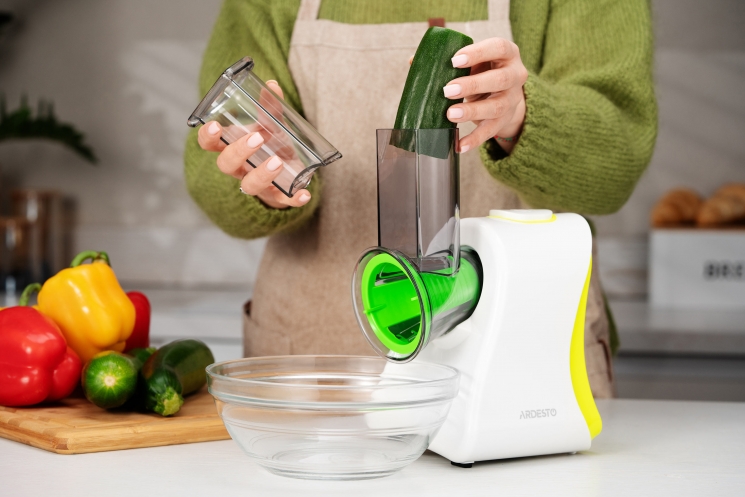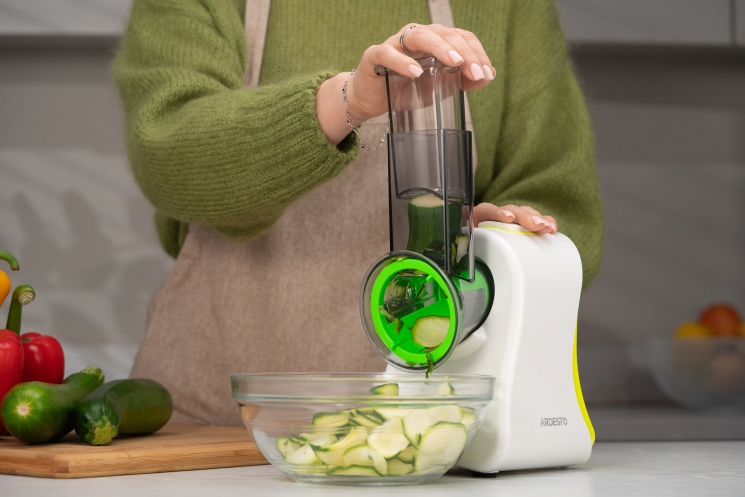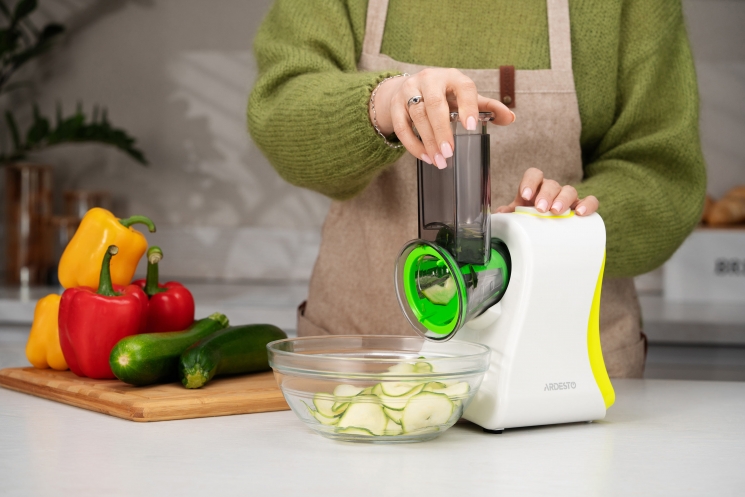 Чотири змінні насадки додають моделі універсальності. Груба шатківниця стане в пригоді для швидкого нарізання овочів для рагу чи салатів, тоді як дрібна забезпечить ніжну текстуру для гарнірів або дитячого харчування. Подрібнювач оптимально згодиться для роботи з горіхами, шоколадом чи овочами, а слайсер стоврить бездоганно рівні скибочки для сервірування.