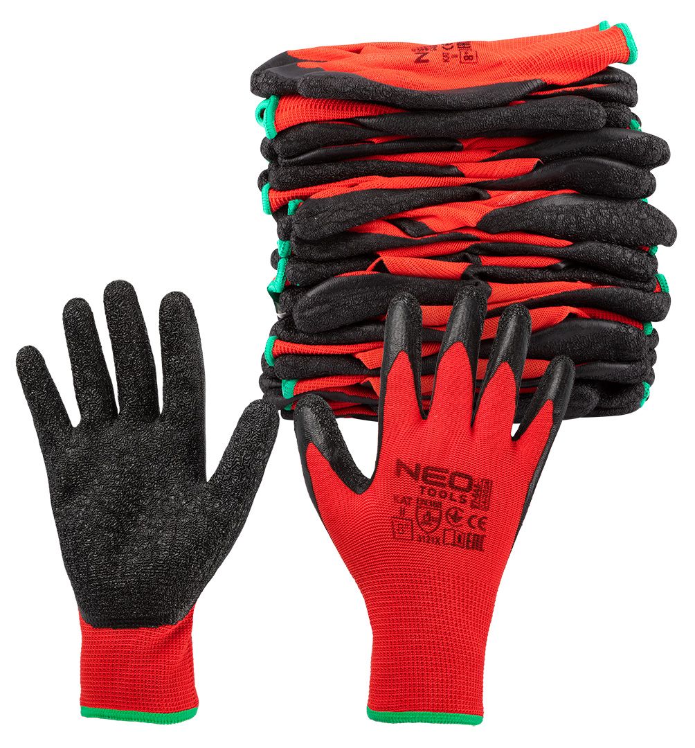 Защитные перчатки Neo Tools комплект 12шт, полиэстер с латексным покрытием, р.8, красно-черный (97-645-8)