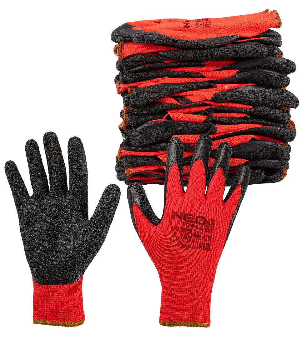 Защитные перчатки Neo Tools комплект 12шт, полиэстер с латексным покрытием, р.9, красно-черный (97-645-9)