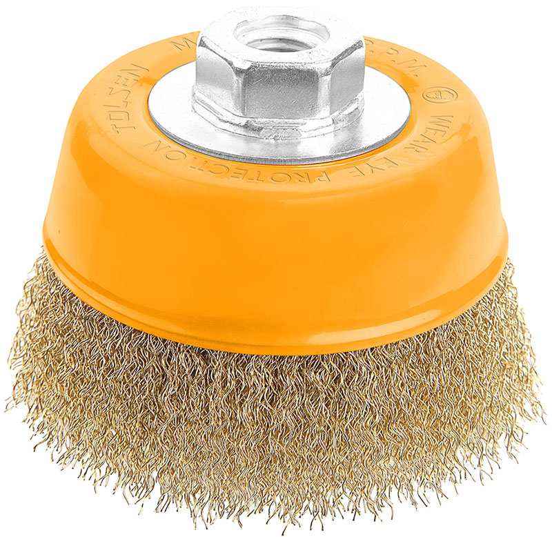 Щетка для электроинструмента Tolsen чашка 75 мм М14, гофрированная латунированная проволока 0.3 мм (77601)