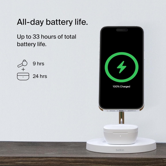 Завдяки зарядному кейсу ви отримуєте до 24 годин прослуховування: 6 годин роботи навушників + 18 годин із кейсом. Функція швидкої зарядки дозволяє за короткий час отримати додатковий час для прослуховування.