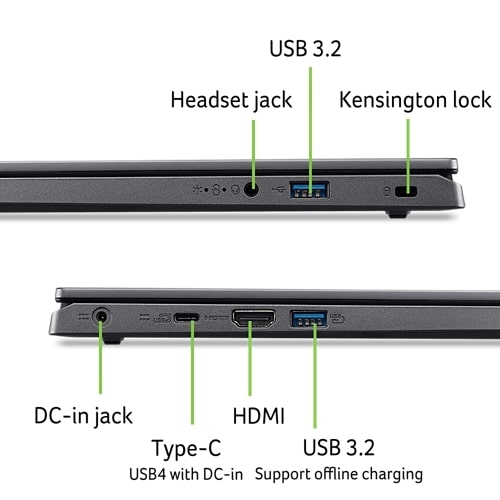 Яскравий 15,6-дюймовий дисплей FHD з тонкими рамками забезпечує широкий огляд, а Acer BlueLightShield захищає очі під час тривалої роботи або навчання, допомагаючи довше зосереджуватися та досягати більшого.