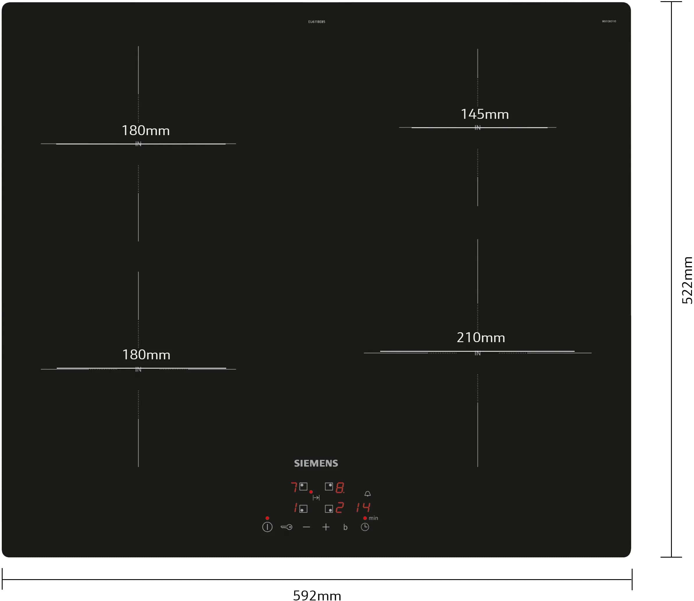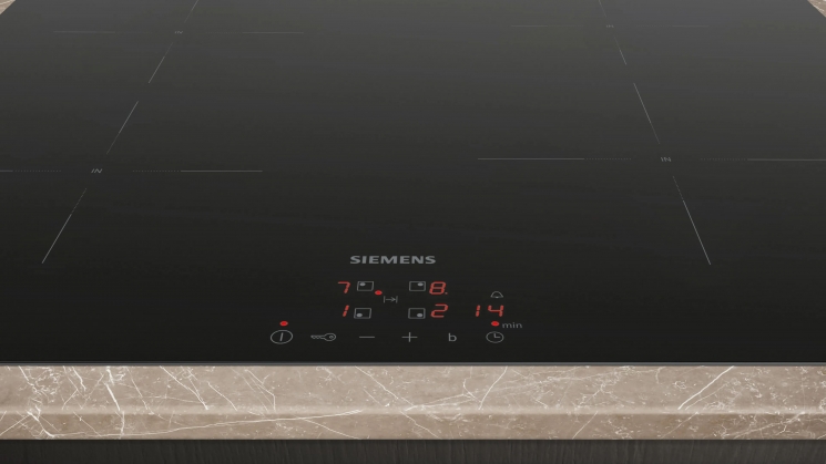 Індукційна варильна поверхня Siemens EU611BEB5E оснащена сенсорним керуванням touchControl із 17 рівнями потужності для точного регулювання нагріву. Функція powerBoost збільшує потужність конфорок на 50%, прискорюючи приготування. Функція quickStart автоматично визначає активну конфорку, а reStart дозволяє відновити налаштування протягом 4 секунд після випадкового вимкнення. Двоступеневий індикатор залишкового тепла, блокування від дітей та автоматичне захисне відключення забезпечують безпеку. Підтримує обмеження споживаної потужності (powerManagement). Безрамковий дизайн ідеально впишеться в сучасну кухню.