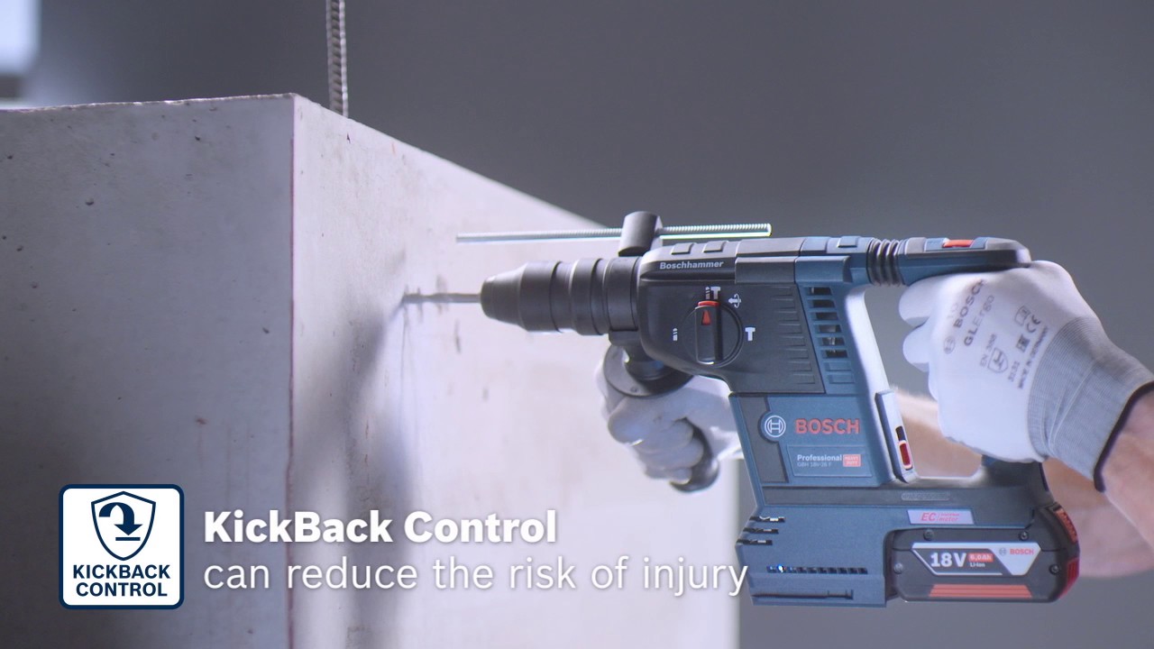 GBH 18V-26 F Professional зі швидкозатискним патроном – це універсальний інструмент у категорії акумуляторних перфораторів Bosch SDS plus, що робить його ідеальним для щоденного використання. Додатковий вузол пиловідведення GDE 18V-16 Professional поєднується з перфоратором, утворюючи автономну систему видалення пилу HEPA для максимальної мобільності. Перфоратор оснащений системами KickBack Control і Electronic Precision Control (EPC) для кращого поводження з інструментом та підвищення захисту користувача. Його потужний двигун забезпечує 2,6 Дж енергії удару для швидкого видалення матеріалу.