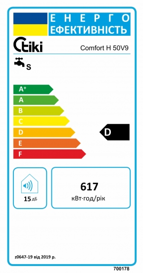 Опис Водонагрівач електр. TIKI круглий GBH, 50л, 2кВт, сухий тен, горизонтальний монтаж, мех. кер-ння, D, білий, 700178