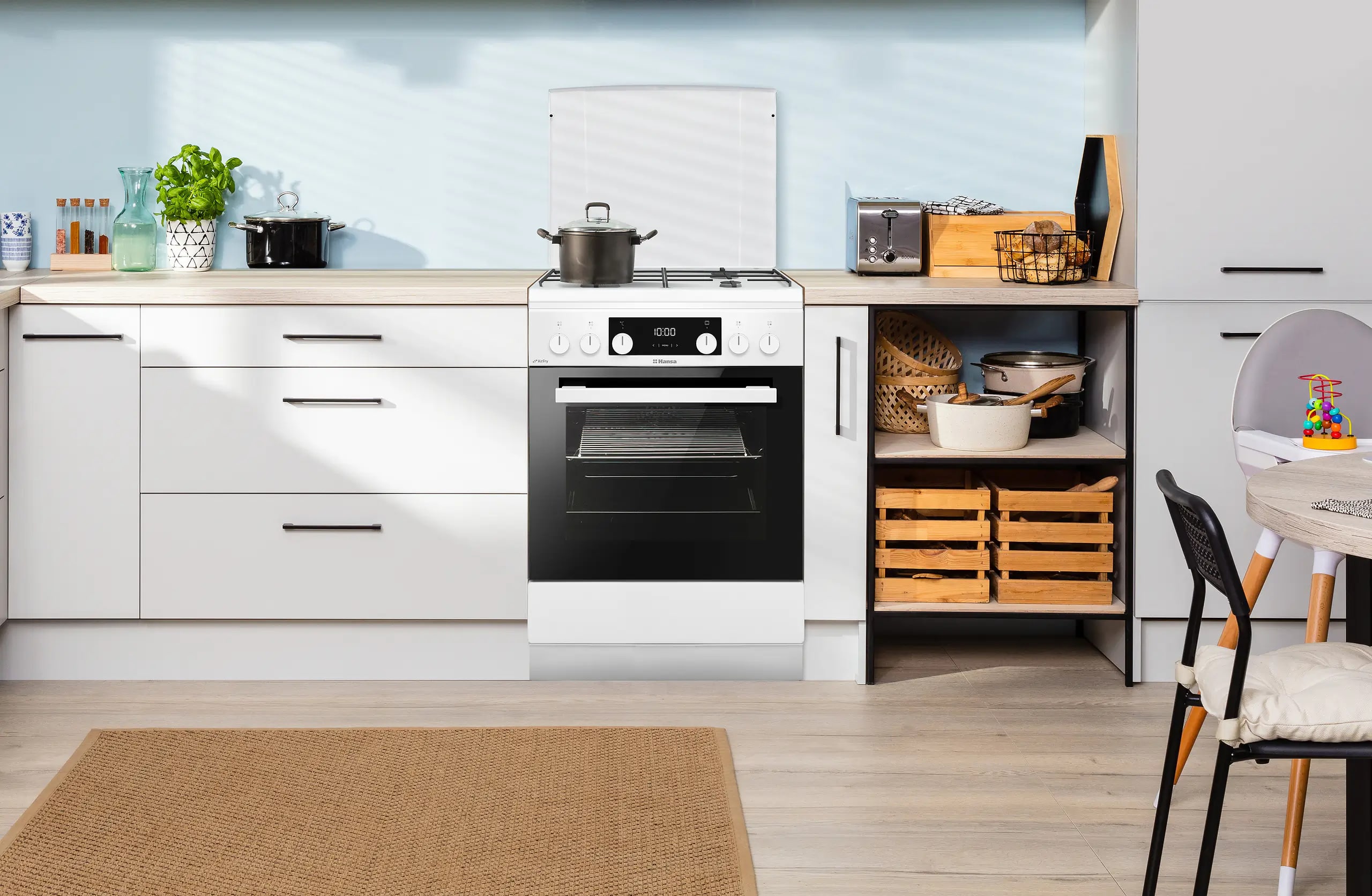 Hansa FCMW69329 – це стильна комбінована плита з білого емальованого покриття, яка забезпечує комфортне приготування. Газова варильна панель оснащена чотирма чавунними конфорками, зокрема потужною турбоконфоркою, автоматичним запалюванням і газ-контролем. Велика 77-літрова електрична духовка пропонує 8 програм, конвекцію та електричний гриль для рівномірного випікання й запікання.