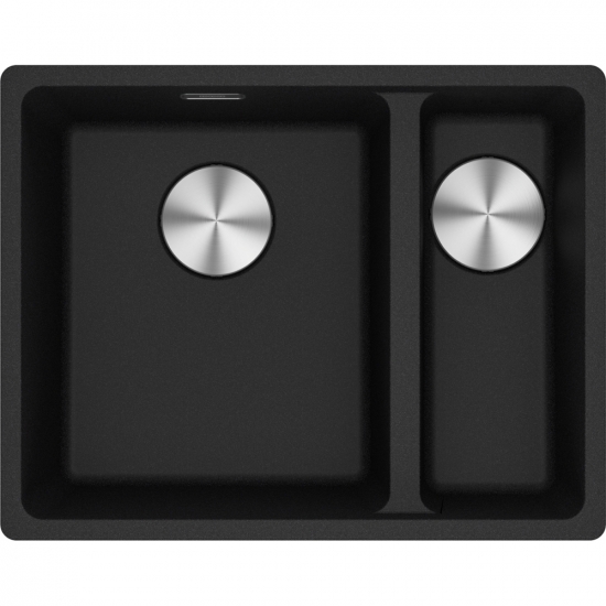 Мийка має сучасну і популярну конструкцію в формі великої і малої чаш без крила. Таким чином максимально ефективно використовується місце на стільниці, а зона мийки має сучасний мінімалістичний вигляд. Для максимальної зручності та гігієни мийка монтується під стільницю, тому на робочій поверхні не буде місць, де назбирується забруднення. Змішувач та інші додаткові аксесуари монтуються на стільниці, завдяки чому ви маєте повну свободу в розміщенні та організації приладів, які поєднує мийка. Для того щоб набрати чи злити воду достатньо повернути ручку управління клапаном і вентиль відкриється чи закриється автоматично. Немає необхідності занурювати руки в воду. Перелив мийки має приховану конструкцію, завдяки чому неприємні запахи залишатимуться в зливній системі, а також не буде видно забруднення завдяки знімній декоративній кришці переливу. Мийка має чашу стандартного розміру. В такій чаші з легкістю помістяться навіть найбільші сковорідки чи каструлі. Необоротна конструкція не передбачає розвороту мийки під час монтажу, хоча якщо ваша кухня вимагає таких рішень і це технічно можливо, ви можете спробувати нестандартний вид монтажу. В комплекті з мийкою постачається декоративна кришка вентиля. Вона має не тільки декоративну функцію, а саме приховує клапан, але й суто практичну. Кришка служить своєрідним фільтром крупних частинок, які не потрапляють у злив, а також блокує бризки в разі використання подрібнювача харчових відходів. При потребі ви можете встановити подрібнювач харчових відходів. Мийка виготовлена з Фраграніту. Він містить до 80% натурального кварцу та до 20% високоякісної акрилової смоли. Такий склад забезпечує неймовірну стійкість до повсякденних впливів та має неперевершений вигляд. Витримує короткочасний вплив високих температур до 280°С.