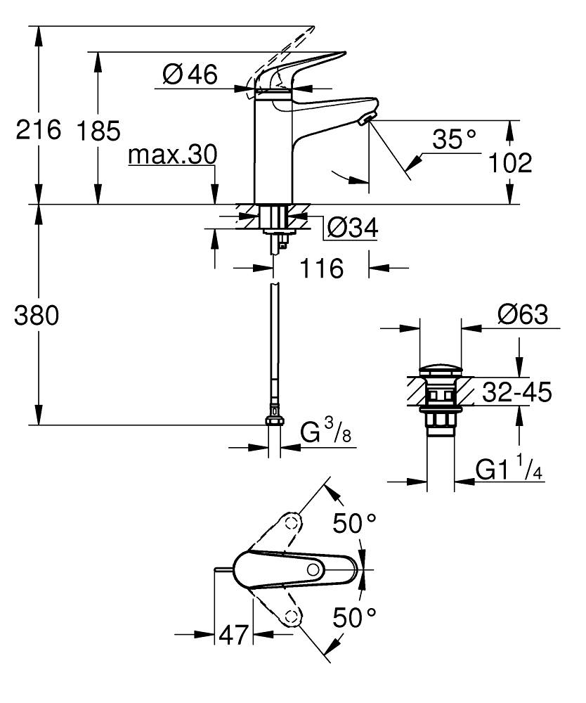 Зливний бачок відкривається і закривається легким натисканням кінчиком пальця, а вбудована функція захисту від дітей означає, що в стандартному положенні важіль заблокований і не може бути повернутий вліво для включення гарячої води, що також дозволяє уникнути марного витрачання енергії на непотрібний розпал бойлера. Довговічний керамічний картридж Grohe Long-Life забезпечує плавне, точне регулювання об'єму та температури води. Вбудований обмежувач температури економить енергію, а технологія Grohe Water Saving зменшує споживання води без шкоди для продуктивності. Ізольовані внутрішні шляхи подачі води гарантують, що вода не містить свинцю та нікелю всередині змішувача.