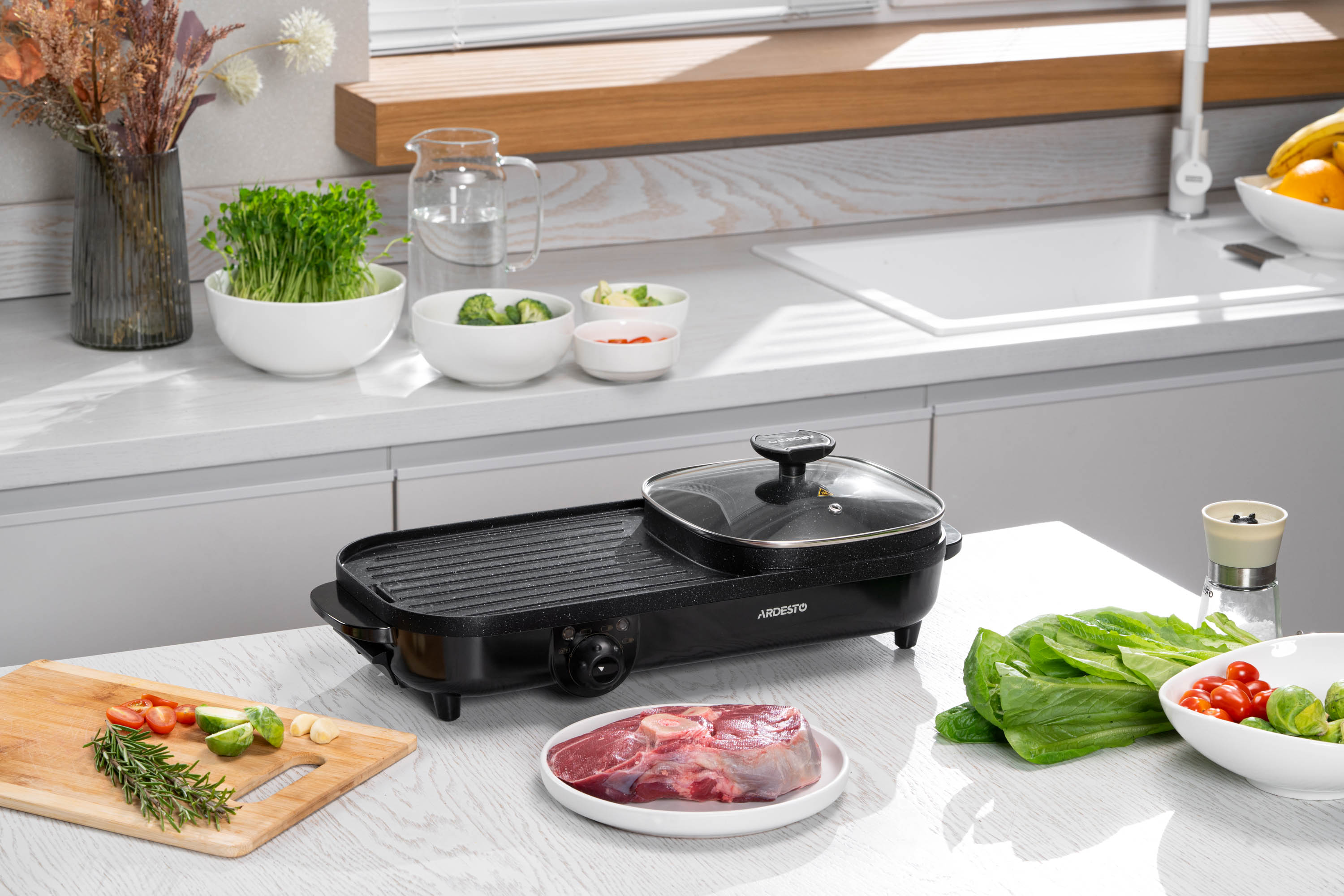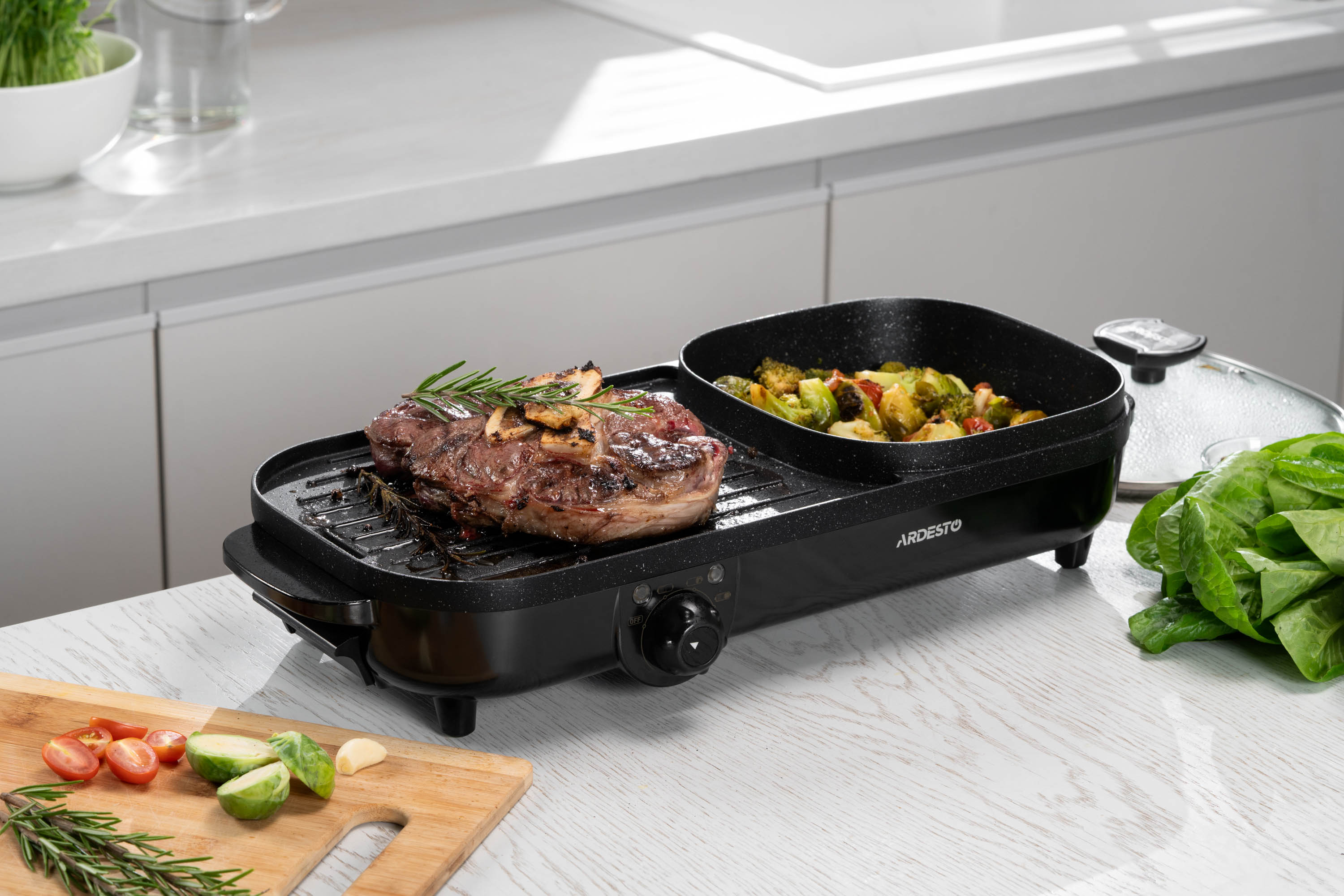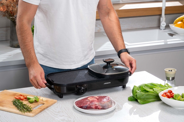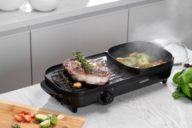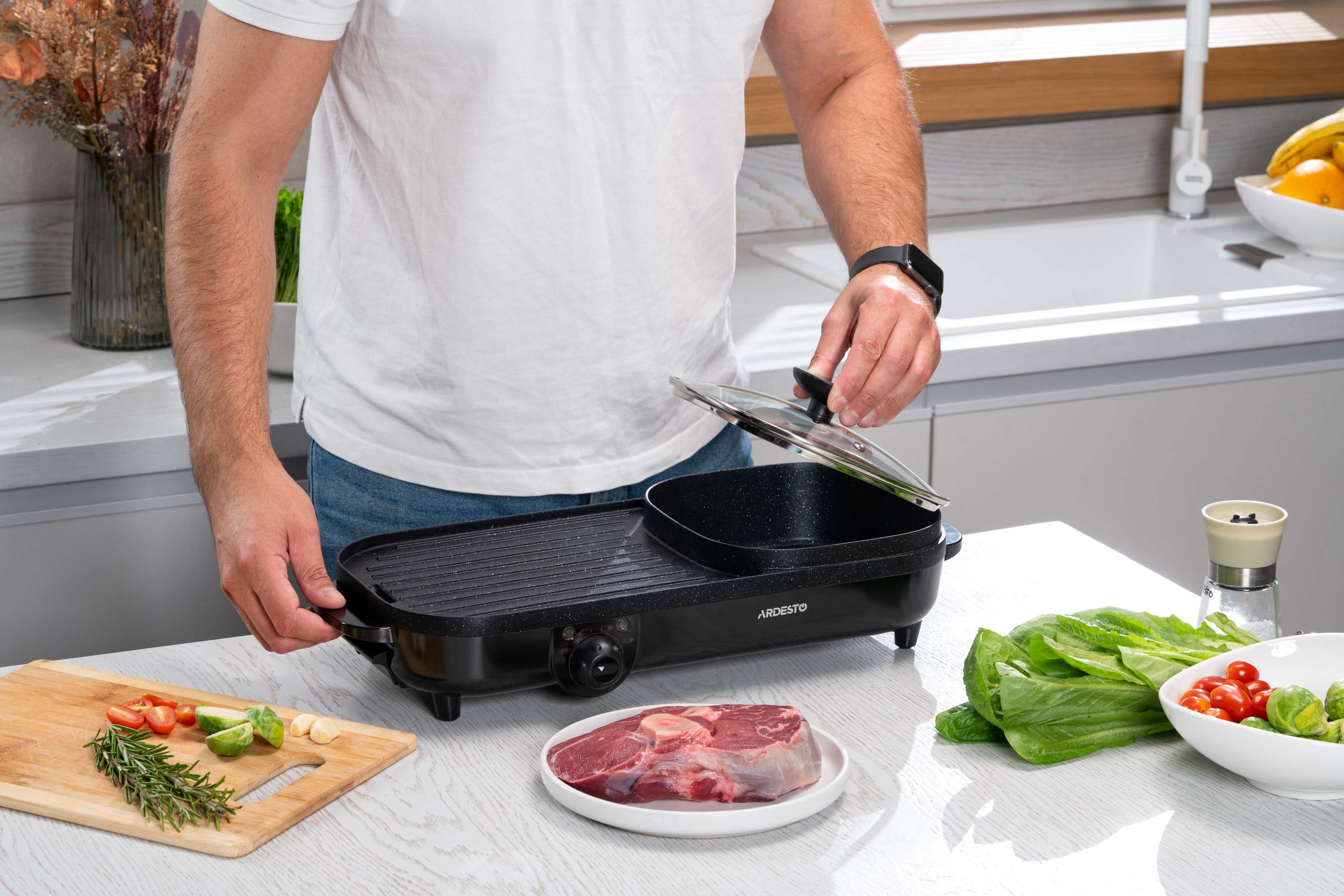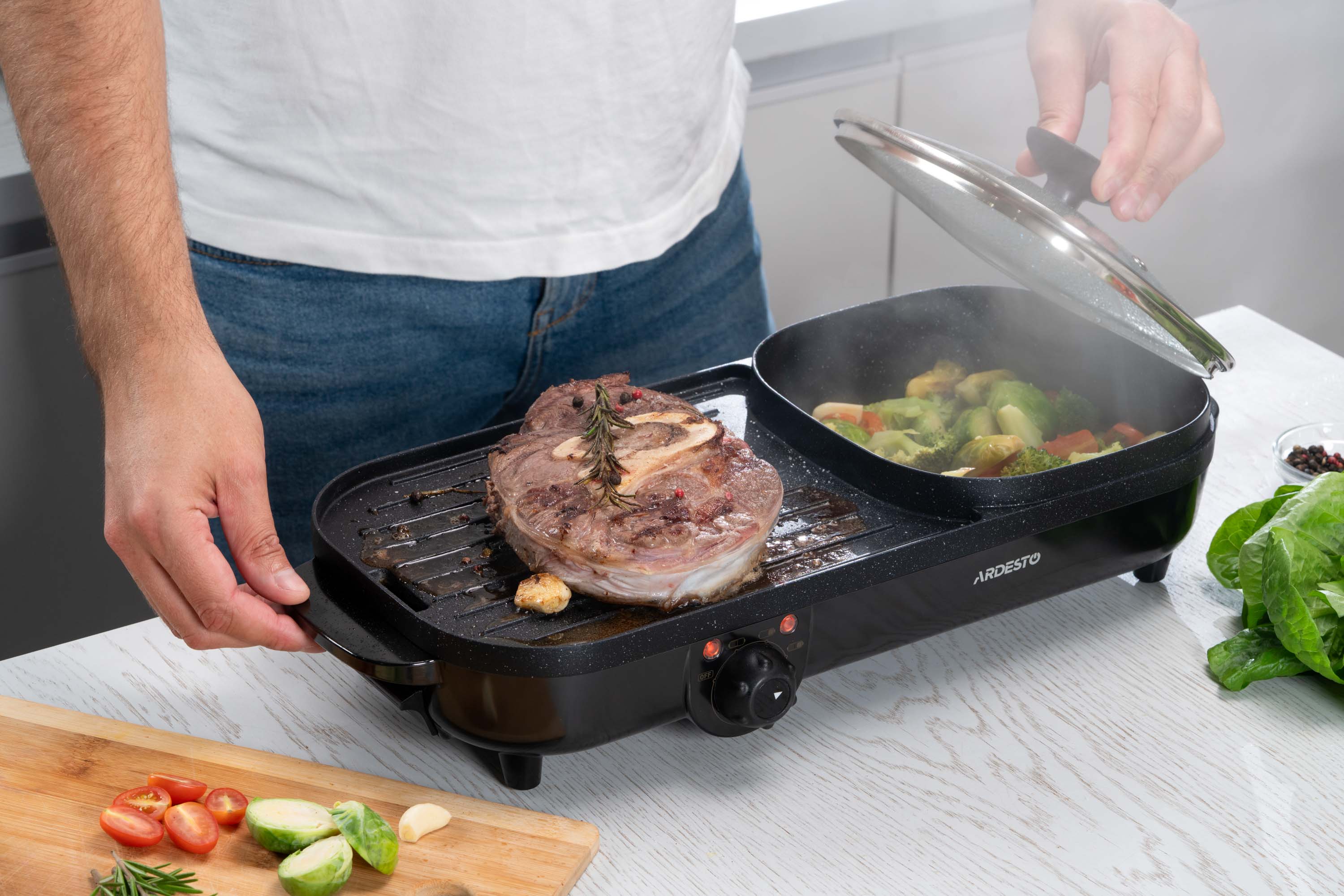Настільний електричний гриль ARDESTO GHP-4 дає змогу готувати м’ясо зі скоринкою, соковиті овочі чи ніжну рибу без зайвого жиру, зберігаючи максимум користі та смаку. Завдяки протипригарному покриттю можна смажити без олії, а увігнута конструкція поверхні відводить надлишковий жир до спеціального знімного піддона. Із регульованим термостатом (від 60 °C до 240 °C) легко налаштувати оптимальну температуру готування. Гриль легко очищувати, зокрема нагрівальну поверхню можна мити під проточною водою, а термоізоляційні руків’я гарантують безпеку використання. Також конструкцією передбачено систему захисту від перегрівання та нековзні ніжки. Потужність 1500 Вт – запорука швидкого нагрівання, а 1-метровий кабель дає змогу зручно розташувати пристрій на кухні чи терасі.