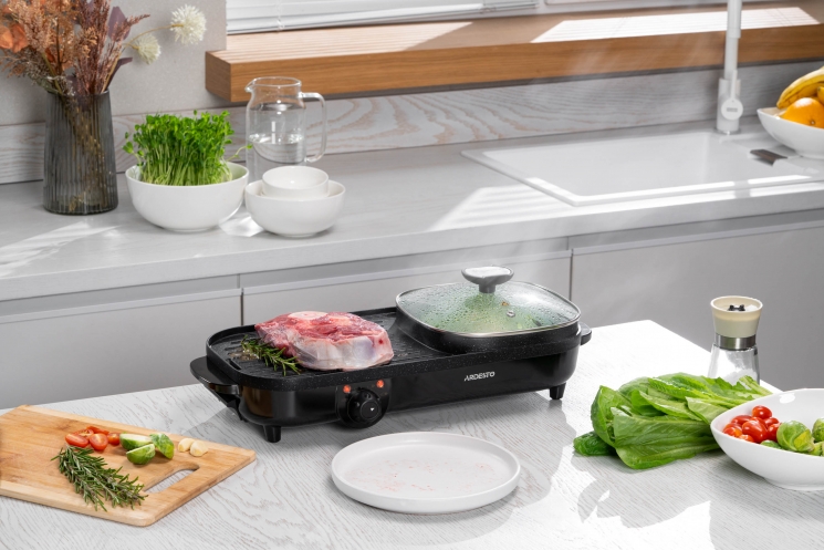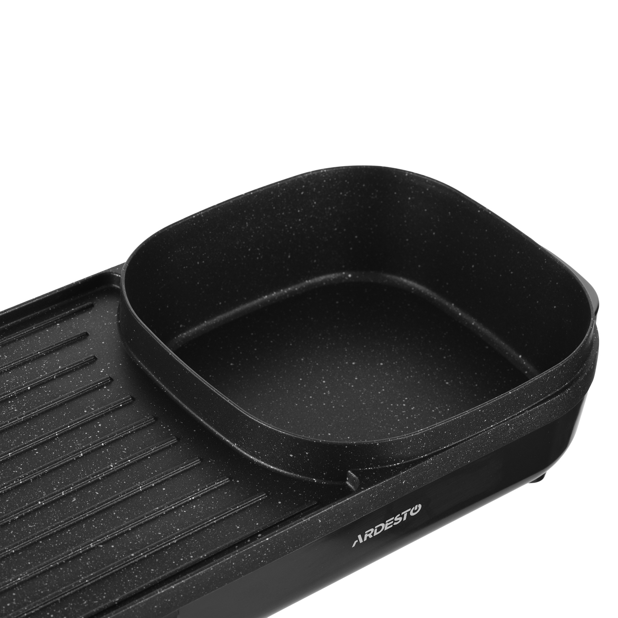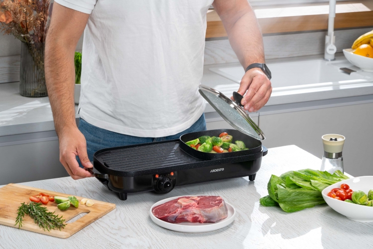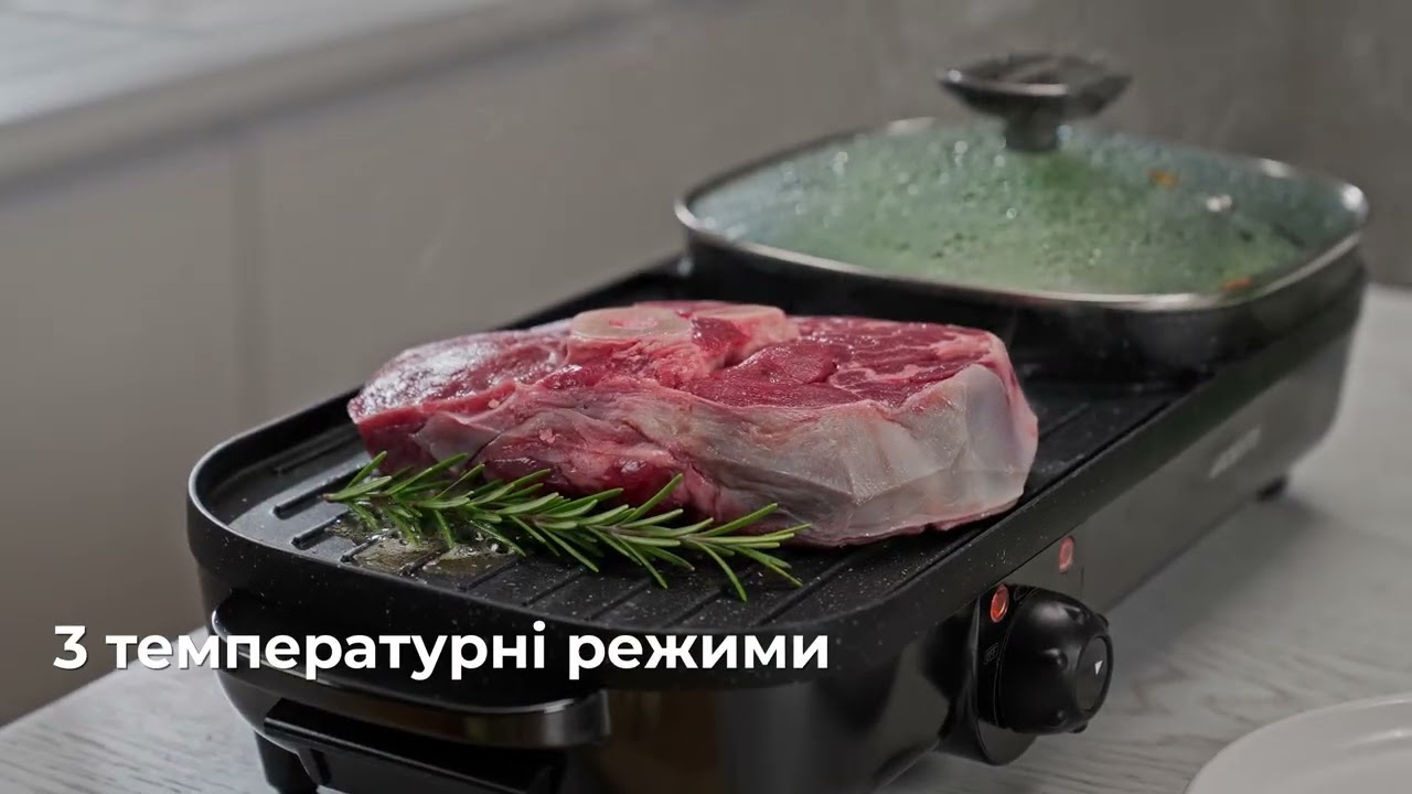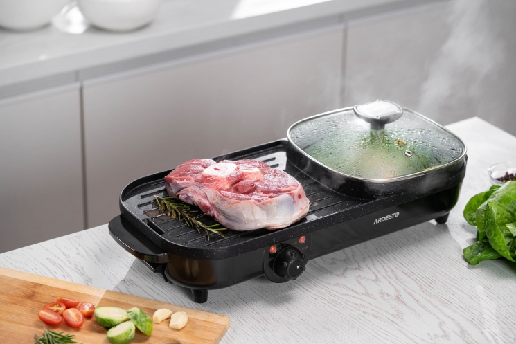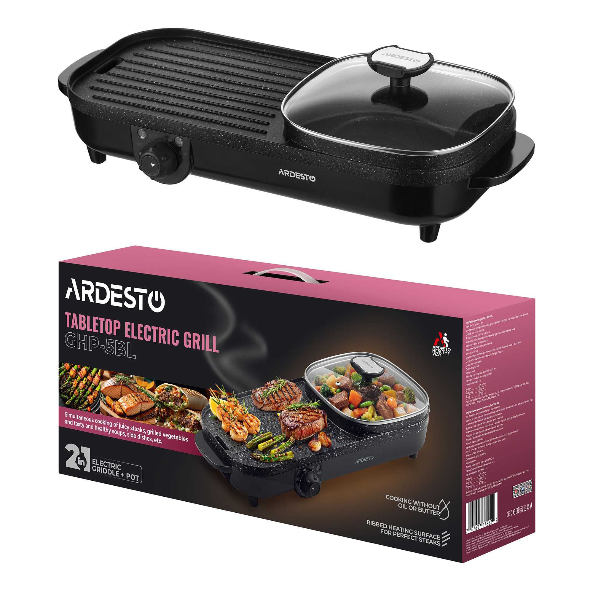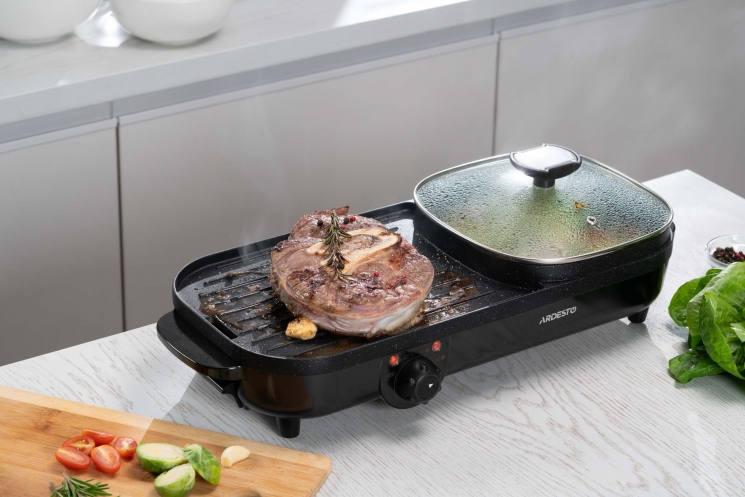 Настільний електричний гриль ARDESTO GHP-4 дає змогу готувати м’ясо зі скоринкою, соковиті овочі чи ніжну рибу без зайвого жиру, зберігаючи максимум користі та смаку. Завдяки протипригарному покриттю можна смажити без олії, а увігнута конструкція поверхні відводить надлишковий жир до спеціального знімного піддона. Із регульованим термостатом (від 60 °C до 240 °C) легко налаштувати оптимальну температуру готування. Гриль легко очищувати, зокрема нагрівальну поверхню можна мити під проточною водою, а термоізоляційні руків’я гарантують безпеку використання. Також конструкцією передбачено систему захисту від перегрівання та нековзні ніжки. Потужність 1500 Вт – запорука швидкого нагрівання, а 1-метровий кабель дає змогу зручно розташувати пристрій на кухні чи терасі.