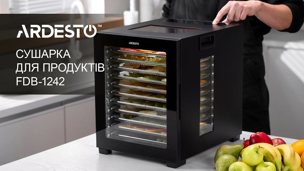 Головна - Побутова техніка, інструменти та товари для дому - Техніка для кухні - Для приготування продуктів - Сушарки продуктів - ARDESTO - Сушарка для продуктів FDB-1242, 850Вт, піддонів -12x3см, макс-70°С, таймер, електр. управління, нерж., чорний