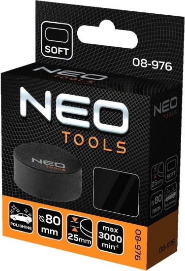 Полірувальна губка NEO (арт 08-976) діаметром 80 мм і товщиною губки 25 мм, кріпиться на липучці. Виготовлений з пінополіуретану. Призначена для використання з ротаційними і ексцентриково-ротаційними полірувальними машинами. Призначена для використання разом з поліролями при остаточній обробці поверхні, залишає лак в глибокому блиску. Рекомендується працювати на максимальній швидкості 3 000 обертів на хвилину. Завдяки міцному поєднанню з тримачем на липучці (арт 08-977) виріб набуває більшої ефективності роботи.