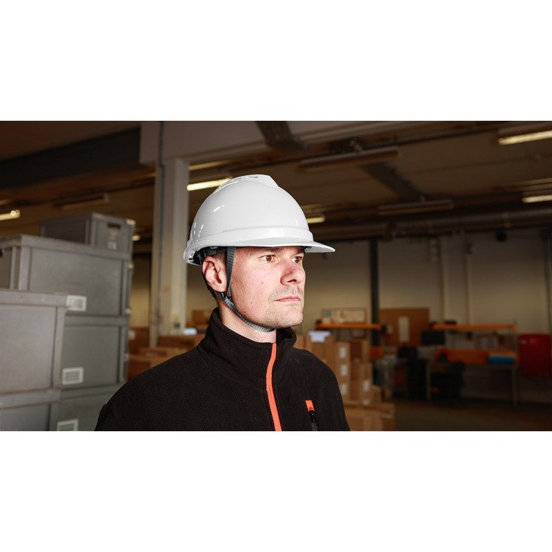 Каска промислова з підборідним ременем, біла 97-221 від NEO - це гарантований захист і комфорт голови. Каска призначена для працівників, які піддаються ризику отримання травм. Стане в нагоді при роботі на риштуваннях, на складі та при земляних роботах