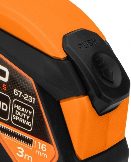 Рулетка сталева 3 м х 16 мм, автоблокування, кнопка стоп, магніт 67-231 від NEO TOOLS - це інструмент з рулеткою довжиною 3 м і шириною 16 мм. Оснащений практичною функцією автоматичної зупинки, яка запобігає самостійному втягуванню рулетки в розгорнутому стані, а також можливістю використання фіксуючого пристрою. Магніт сприяє кращій стабілізації рулетки, а збільшений друк впливає на швидкість зчитування результатів вимірювань.