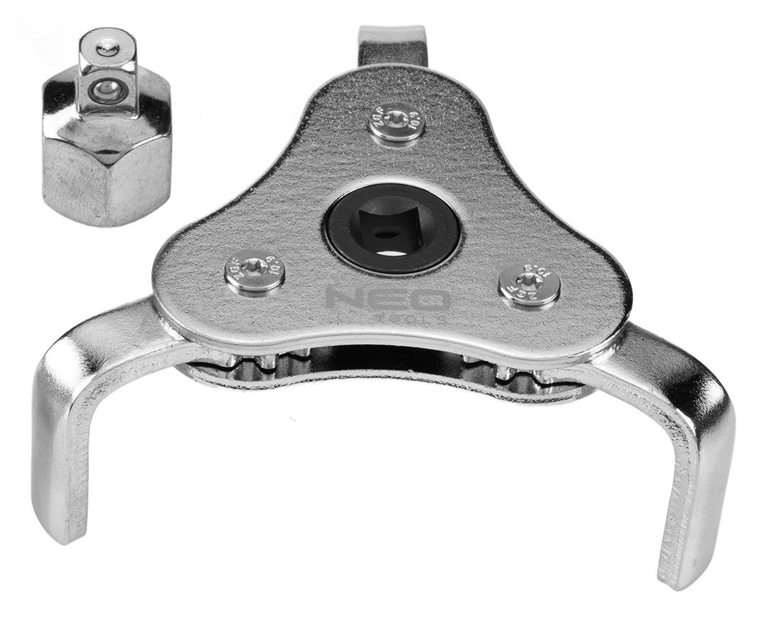 Ключ для масляних фільтрів NEO для професійних автосервісів і автомайстерень, а також для просунутих любителів. Ключ призначений для ефективного і правильного монтажу зовнішніх масляних фільтрів з металевим корпусом. Ключ має плоскі губки. Трирука конструкція. Підходить для фільтрів діаметром від 64 до 100 мм. Поставляється в комплекті з редуктором 3/8" і 1/2".