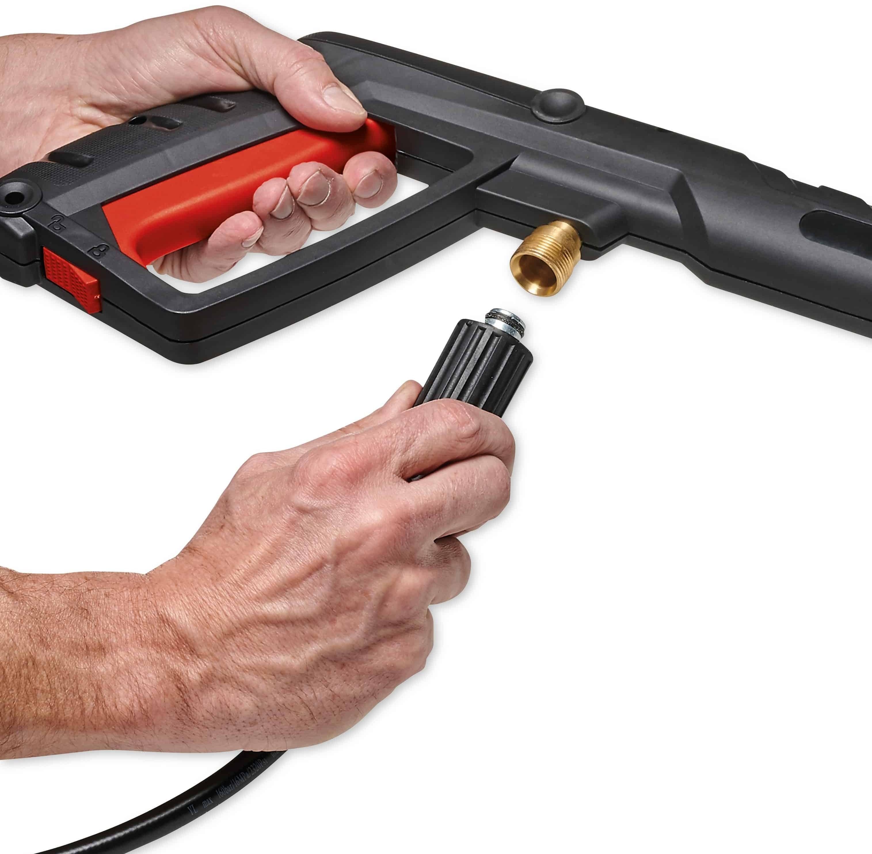 З'єднання з водою має вбудований фільтр для попереднього очищення води, що захищає мийку від забруднень і подовжує термін її служби. Модульна система Quick-Couple дозволяє швидко змінювати насадки, а потужність водяного струменя та його напрямок можна регулювати за допомогою форсунок, що забезпечує максимальний комфорт і ефективність під час роботи.