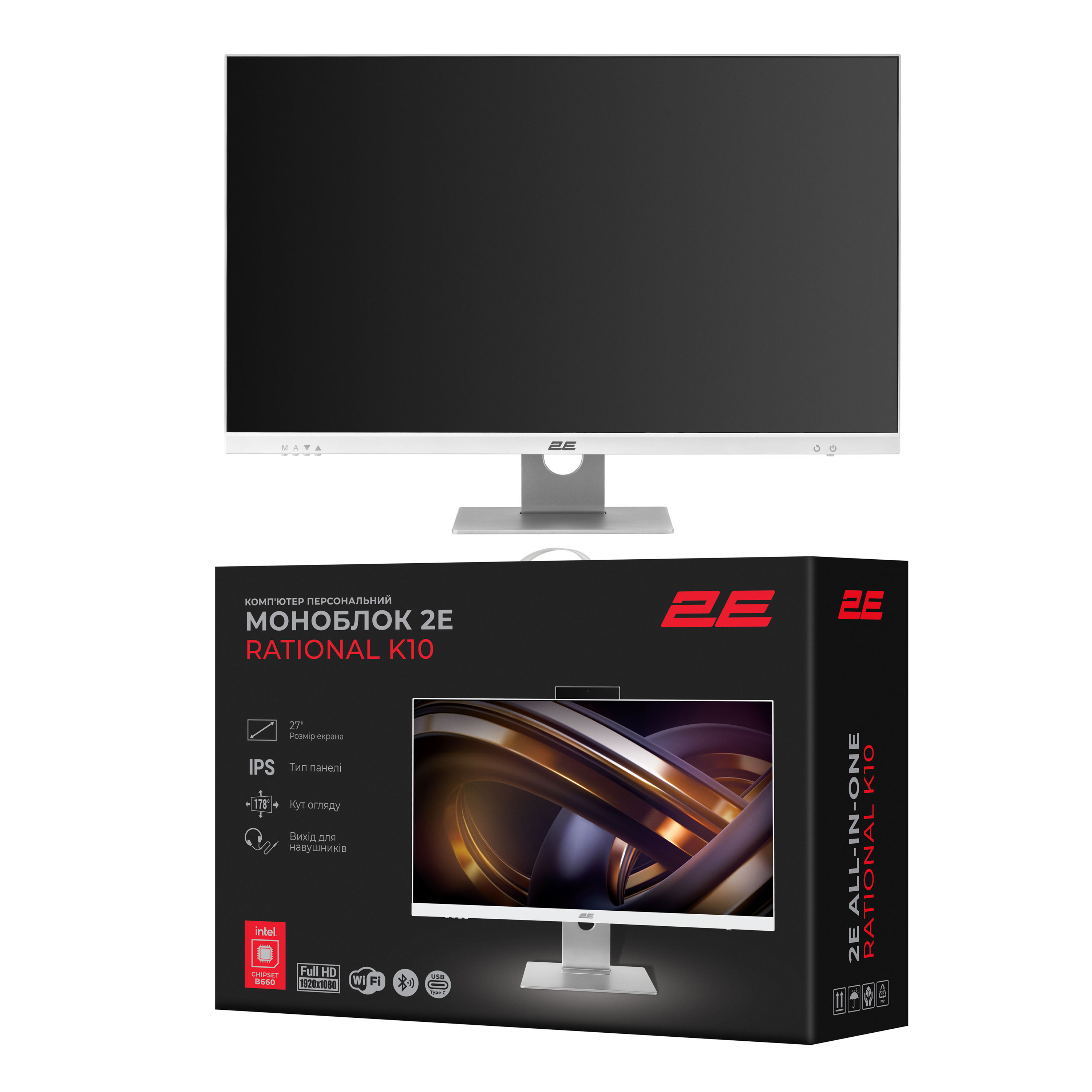 Опис Комп'ютер персональний моноблок 2E Rational K10 27" FHD IPS Intel i3-12100, 16Gb, F512GB, UMA, B660, K10.660, 150W, FreeDos, білий