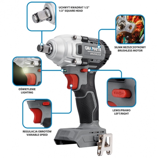 Характеризується швидкістю 1600 об/хв (1-а передача), 2000 об/хв (2-а передача) і 2600 об/хв (3-я передача). Частота ударів відповідає 2000/2500/3300 уд/хв. Гайковерт оснащений надійним безщітковим двигуном. Рекомендована ємність акумулятора - 4 Ач, що забезпечує 98 хвилин роботи в режимі холостого ходу (для акумулятора на 6 Ач - 147 хвилин, на 8 Ач - 210 хвилин). Інструмент марки GRAPHITE рекомендується для механіків, автолюбителів, покрівельників, любителів "зроби сам" і для домашнього використання.