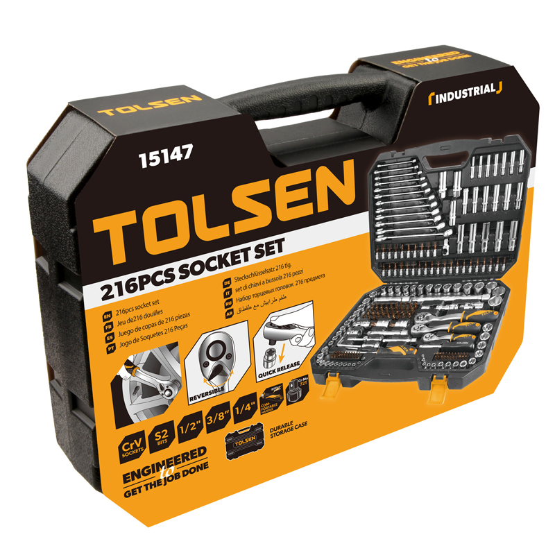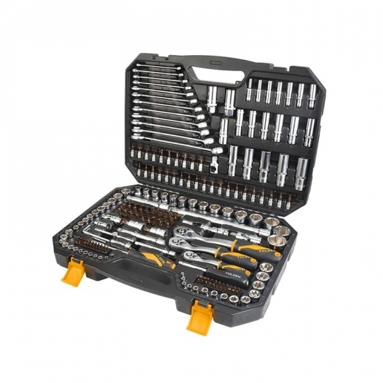Опис Набір інструментів Tolsen, 1/2", 1/4", 3/8", комбіновані ключі, торцевы головки, біти,CrV, кейс, 216шт